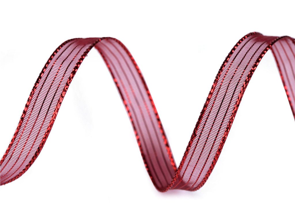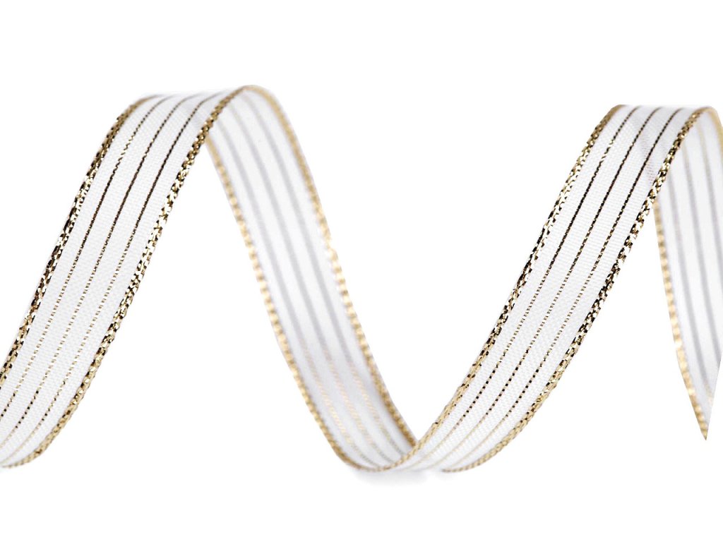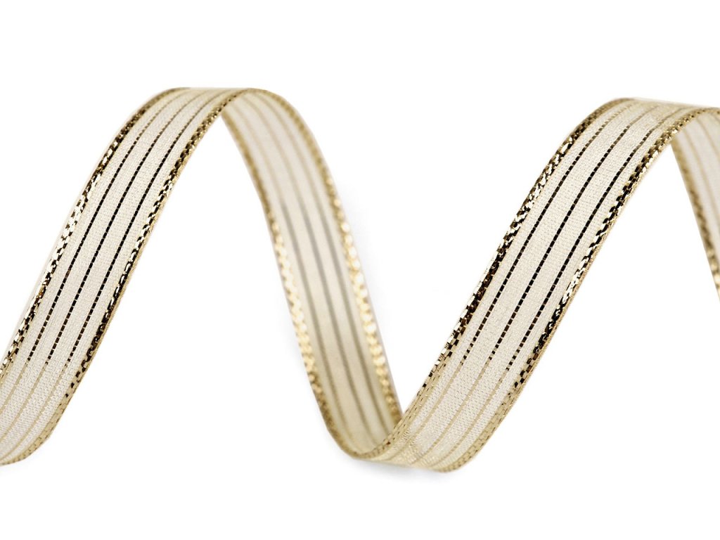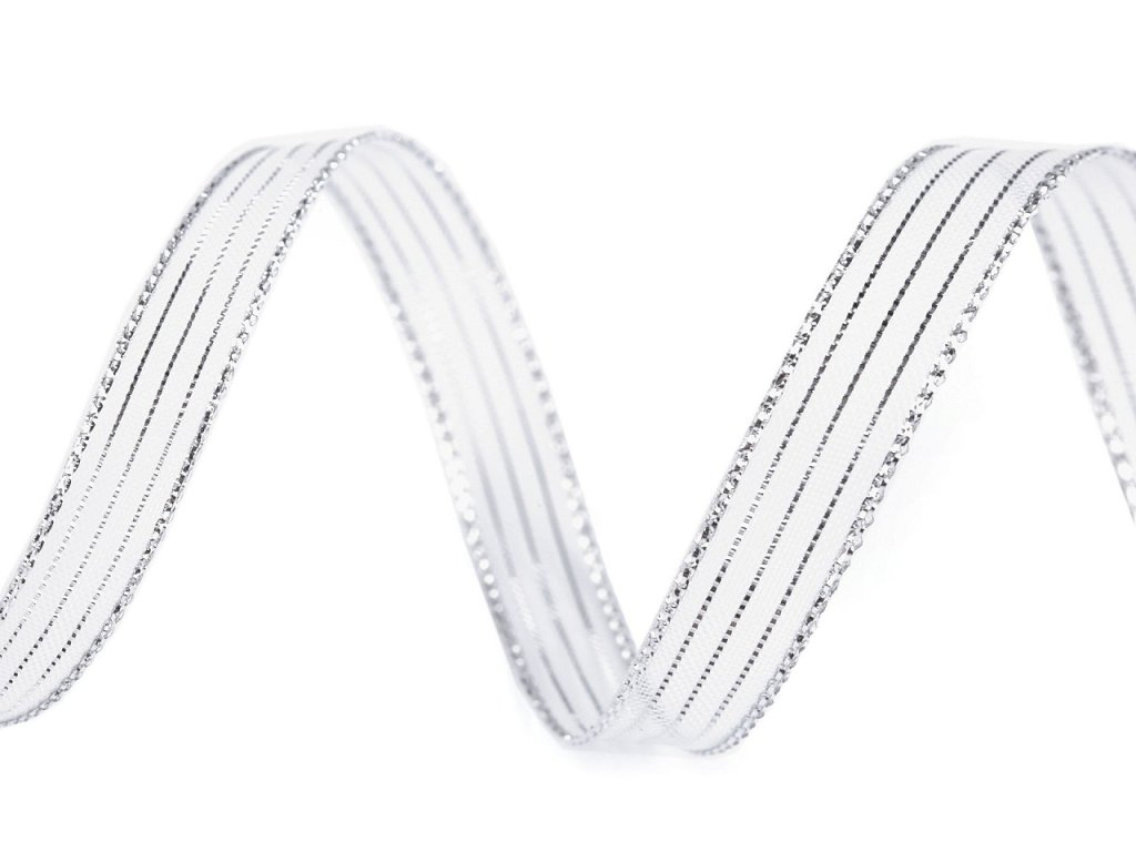 Třpytivou dekorační stuhu zdobí proužky z lurexu. Je pevná, oboustranná, uvázané mašle drží pěkně tvar.