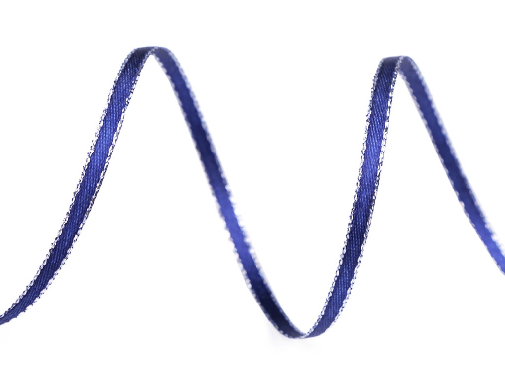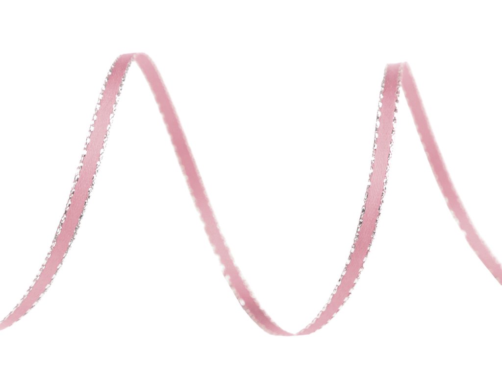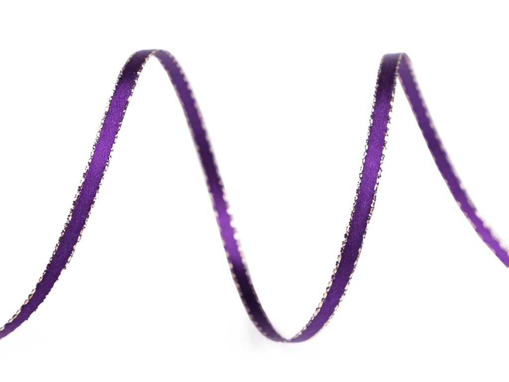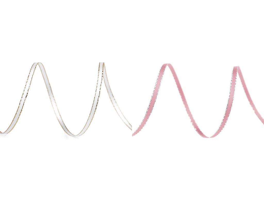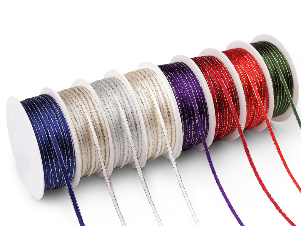 Oboulící atlasová stuha je pevná a jemně se leskne. Po stranách ji zdobí třpytivý lurex.