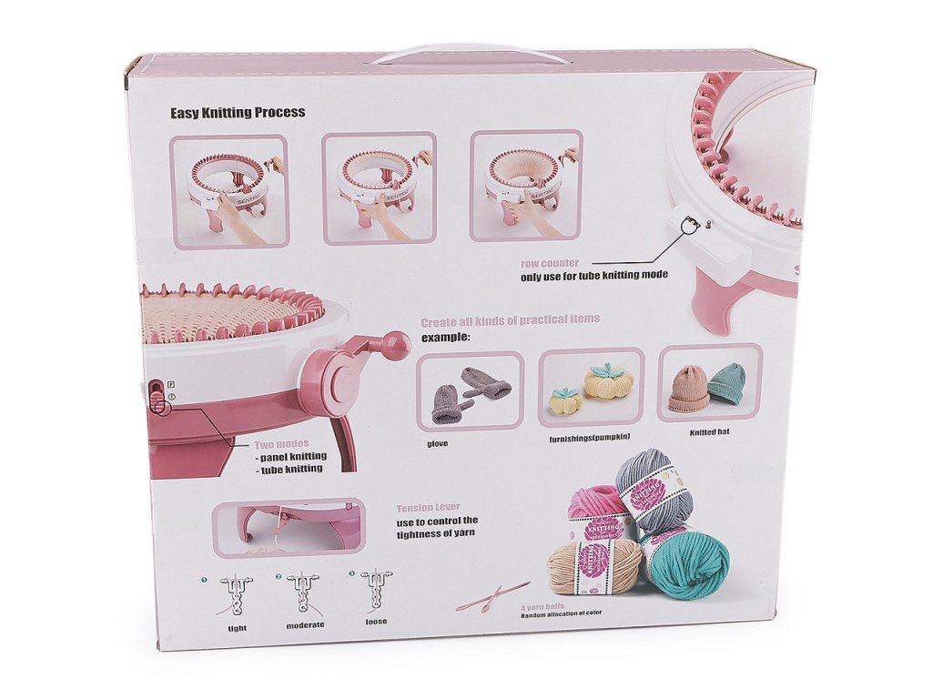 Balení obsahuje: 1 pletací mlýnek, 3 plastové jehly na přízi, 1 plastový háček, 4 klubíčka příze v různých návinech, kovový šroubovák, 4 kovové šroubky na přišroubování nožek a 4 přísavky, pomocí kterých mlýnek připevníte ke stolu.