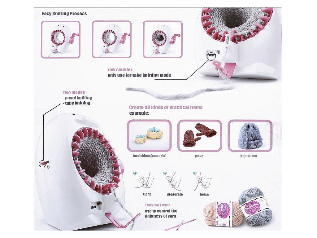 Mlýnek na pletení vám pomůže snadno a neuvěřitelně rychle uplést dětské čepice, šály, rukavice a různé menší dekorace. Podle podrobného přiloženého návodu, který obsahuje i obrázky, dokáže plést opravdu každý. Nemusíte umět plést na jehlicích. Na mlýnku se dají plést tunely i pruhy.