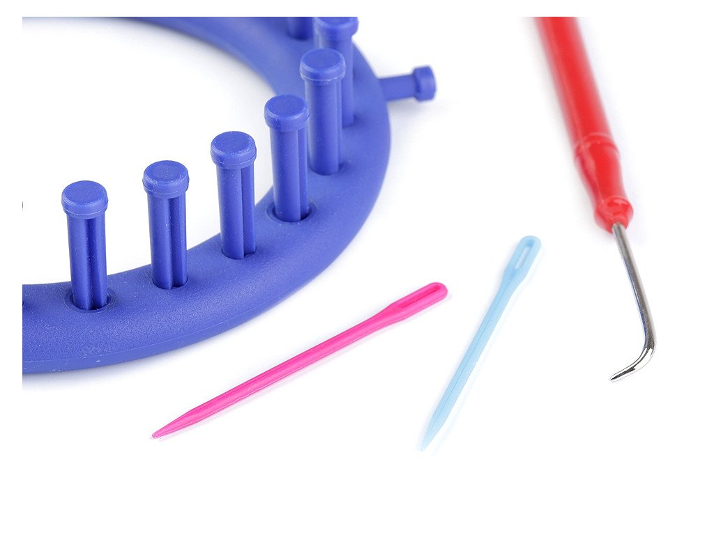 Balení obsahuje kovový háček pro snadné snímání ok a 2 plastové jehly k zapošití příze. Součástí balení je i podrobný návod v češtině, slovenštině a angličtině. Na kruhu je 24 hrotů + 1 pomocný hrot je z boku.
