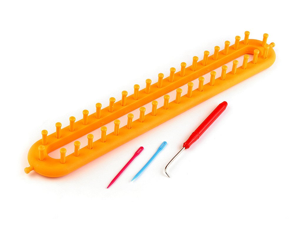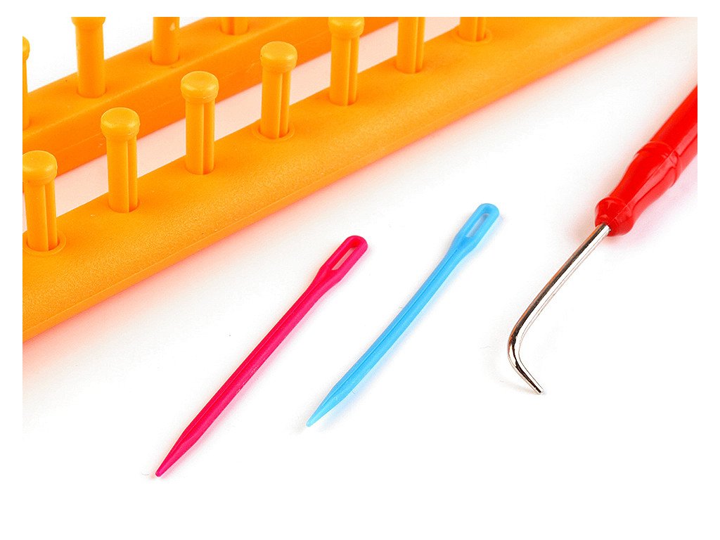 Balení obsahuje kovový háček pro snadné snímání ok a 2 plastové jehly k zapošití příze. Součástí balení je i podrobný návod v češtině, slovenštině a angličtině. Na rámečku je 38 hrotů + 2 pomocné hroty z boku.