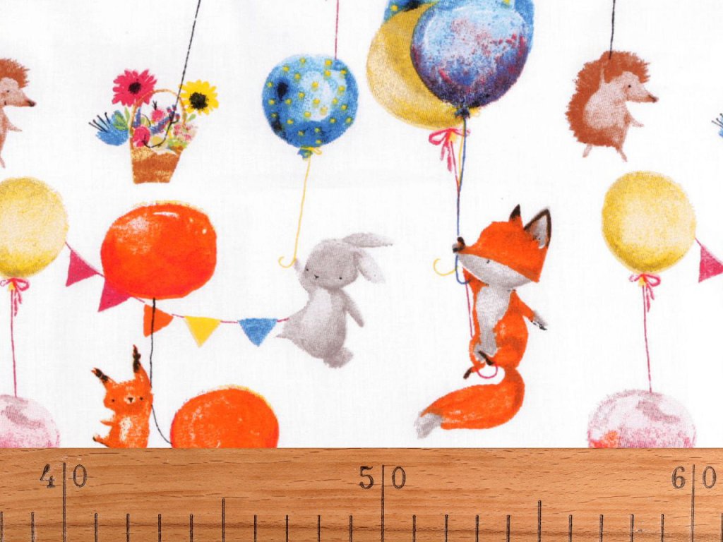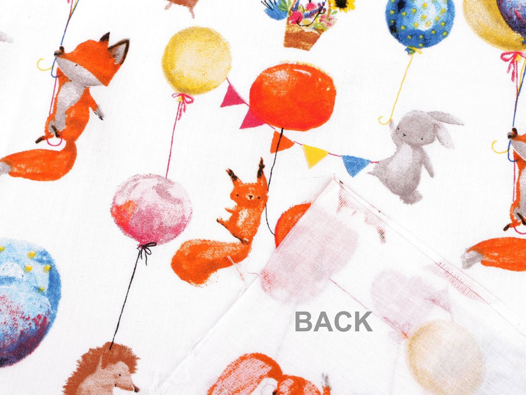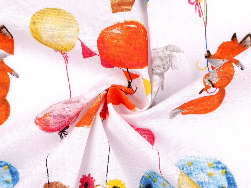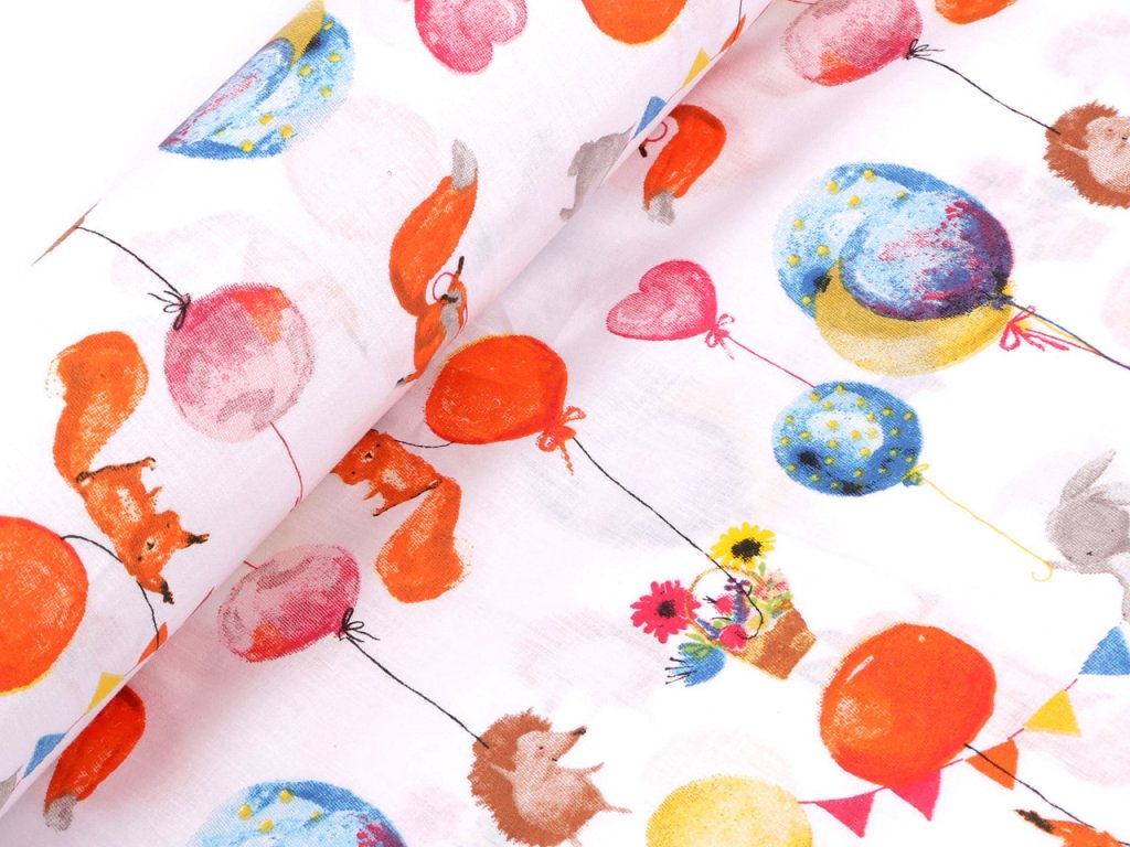 Z bavlněného plátna můžete ušít povlečení, kapsáře, tašky, pytlíky, mantinely do postýlek apod. Najdete na něm barevné obrázky zvířátek s balónky.