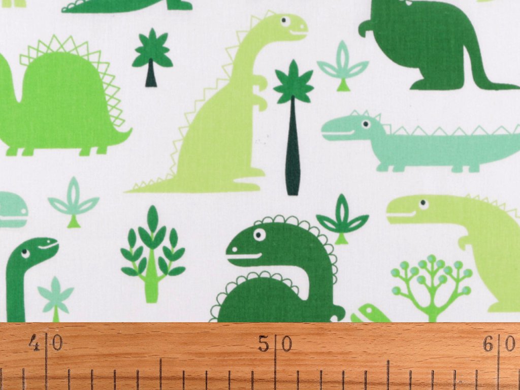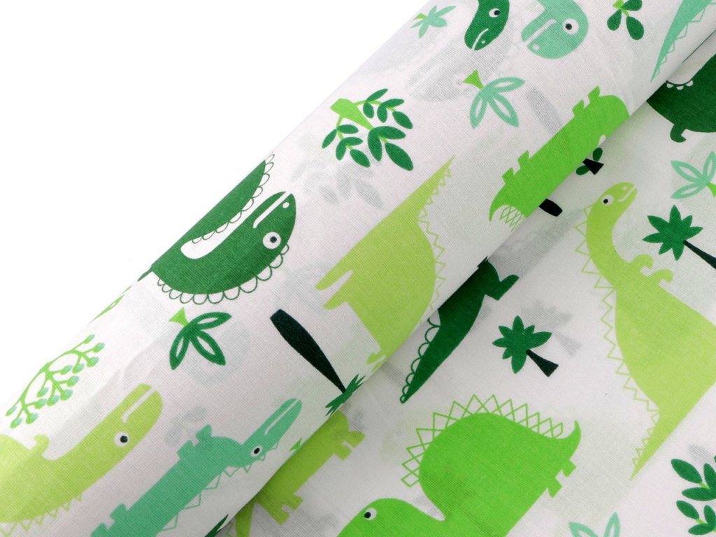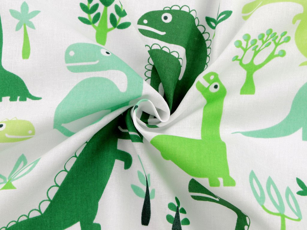 Z bavlněné látky s dinosaury můžete ušít kapsáře, tašky, pytlíky, povlečení či závěsy, které promění dětský pokoj ve fantazijní svět plný těchto prehistorických tvorů.