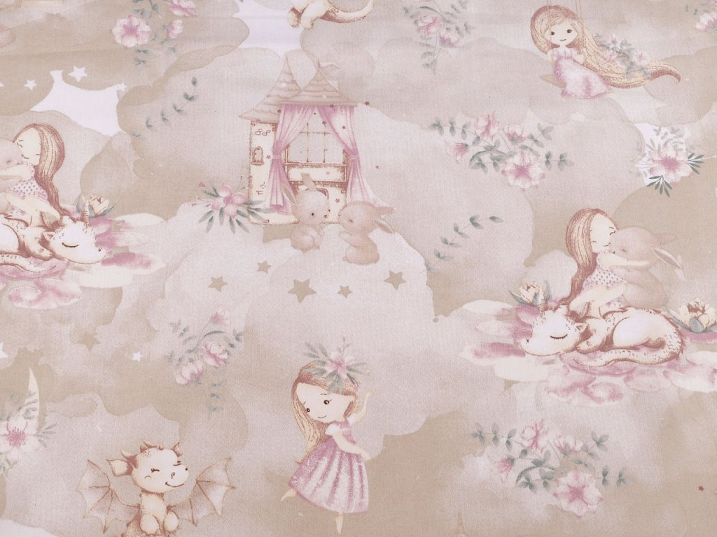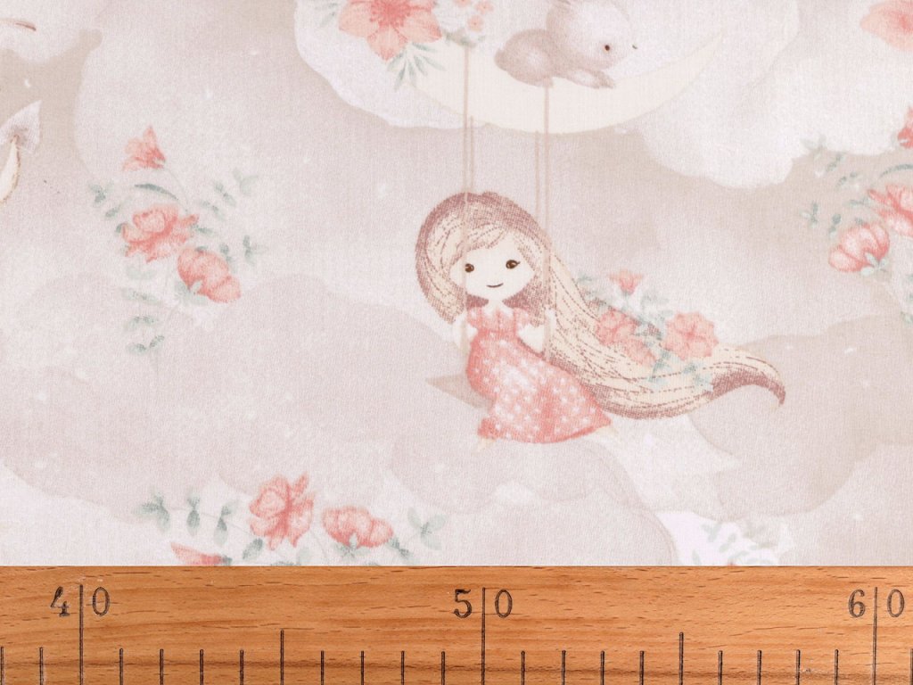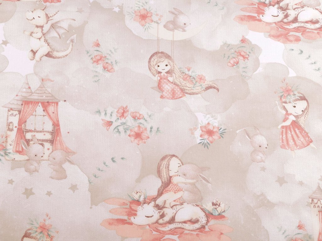 Bavlněnou látku zdobí jemné dívčí motivy, které vyniknou na dětském povlečení, polštářích a dekoračních doplňcích do dětského pokoje. Můžete z ní ušít i pytlíky, batůžky a tašky.
