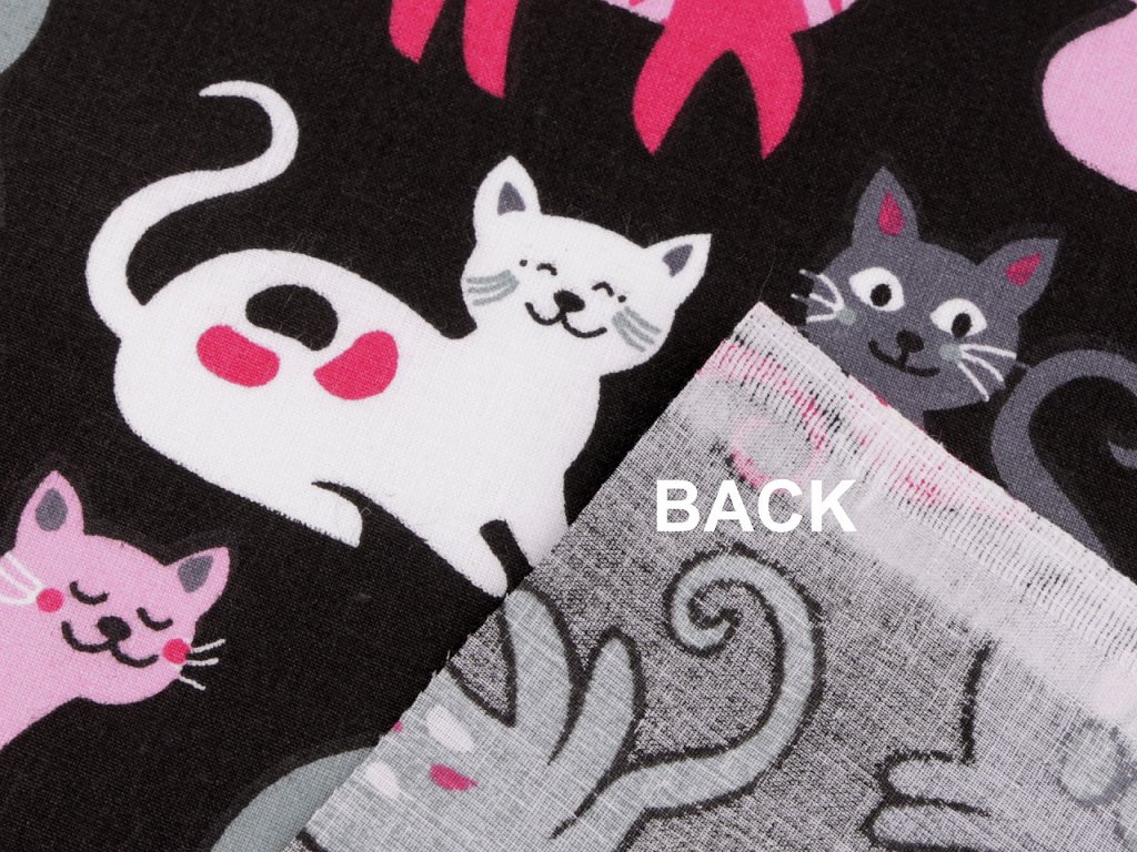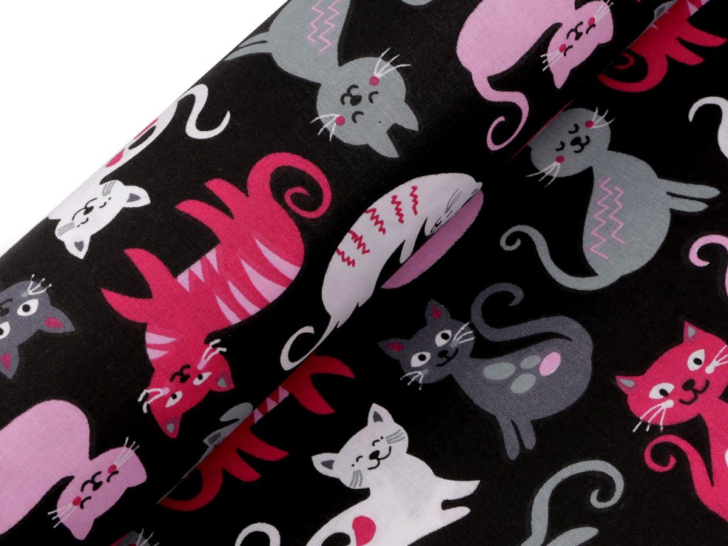 Bavlněnou látku zdobí potisk barevných koček. Využijete ji na šití polštářů, povlečení, závěsů, pytlíků, tašek a dalších doplňků.