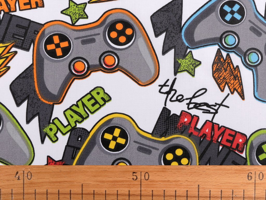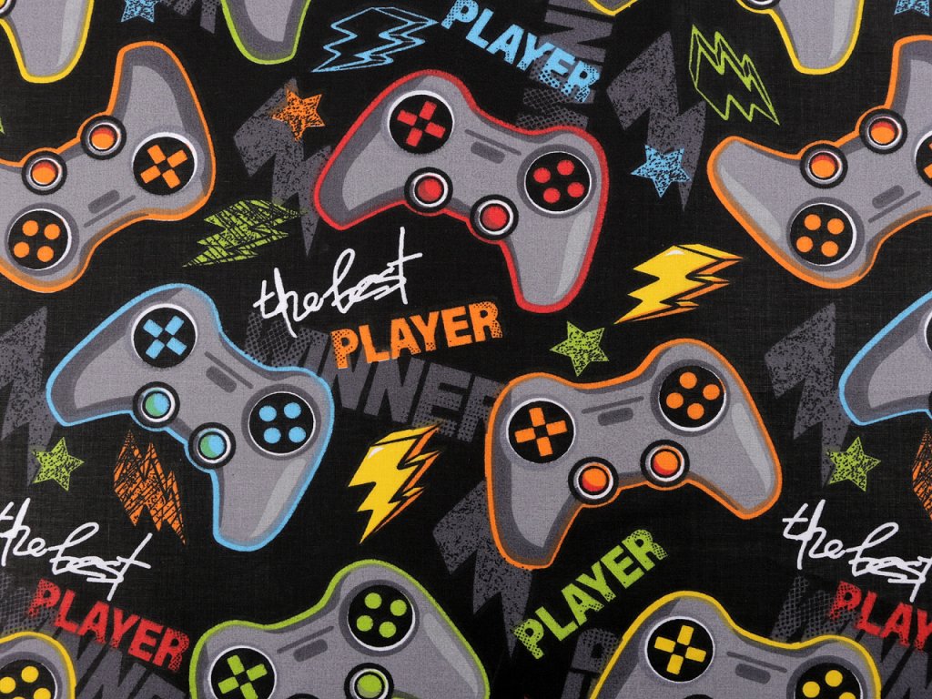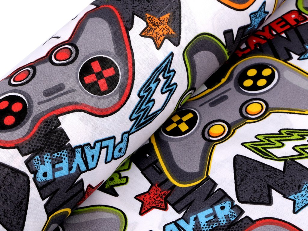 Bavlněnou látku zdobí obrázky herních konzolí, které ocení nejen mladší, ale i starší generace herních nadšenců. Je vhodná na šití polštářů, povlečení, hnízd pro děti, kapsářů, tašek, pytlíků apod.