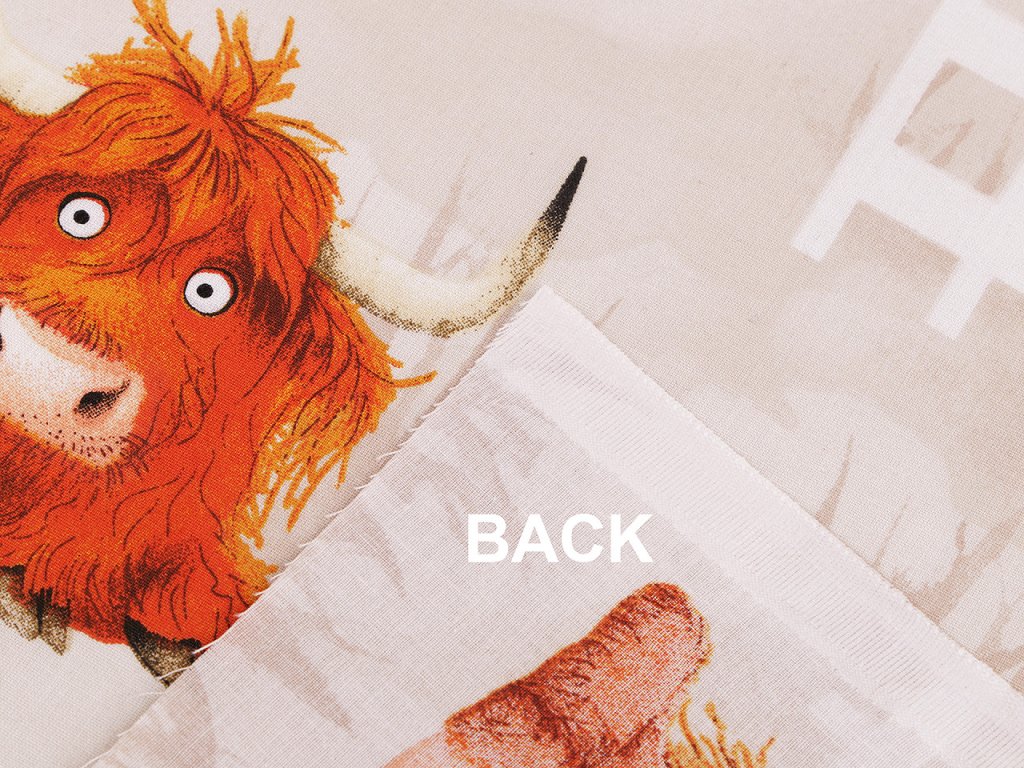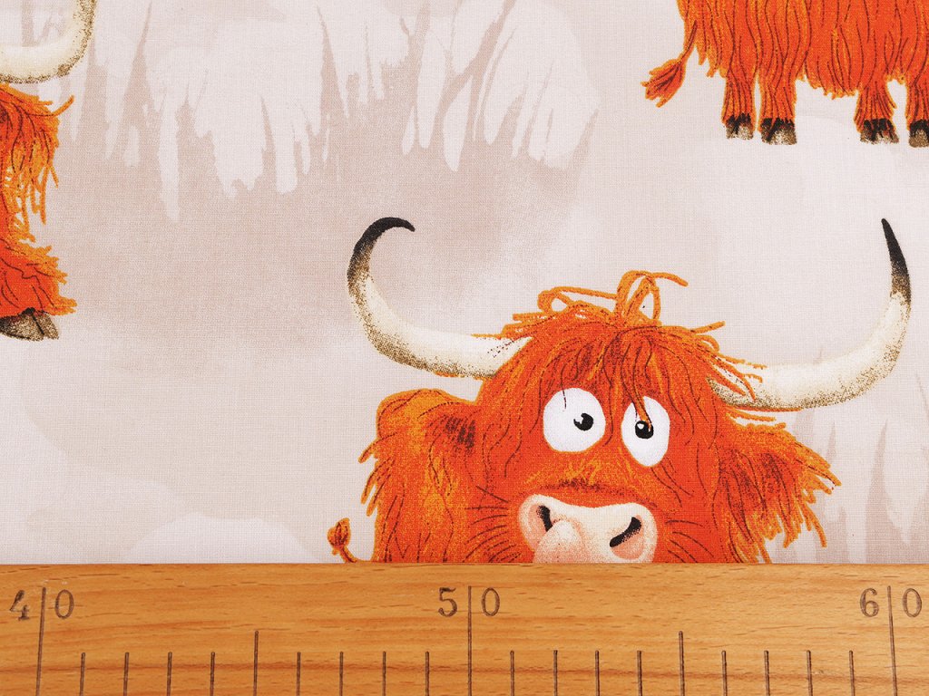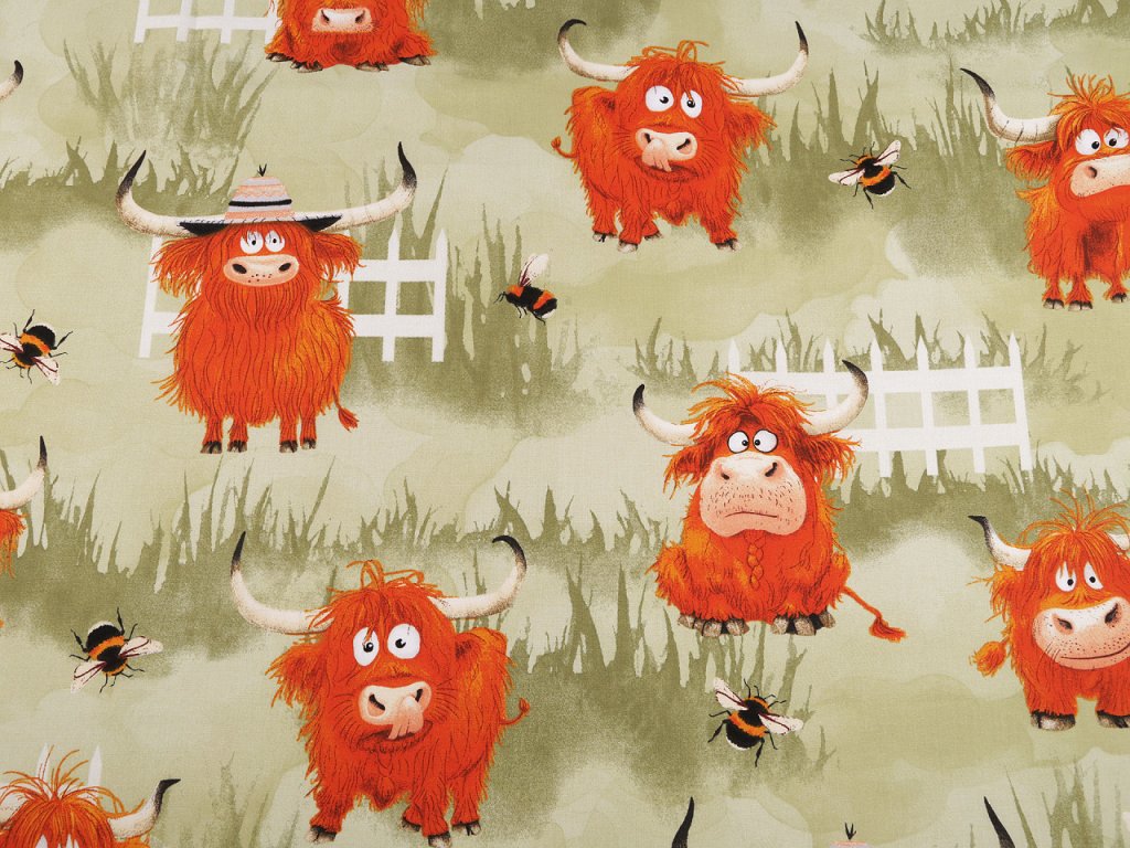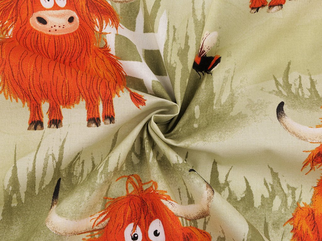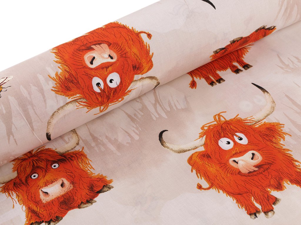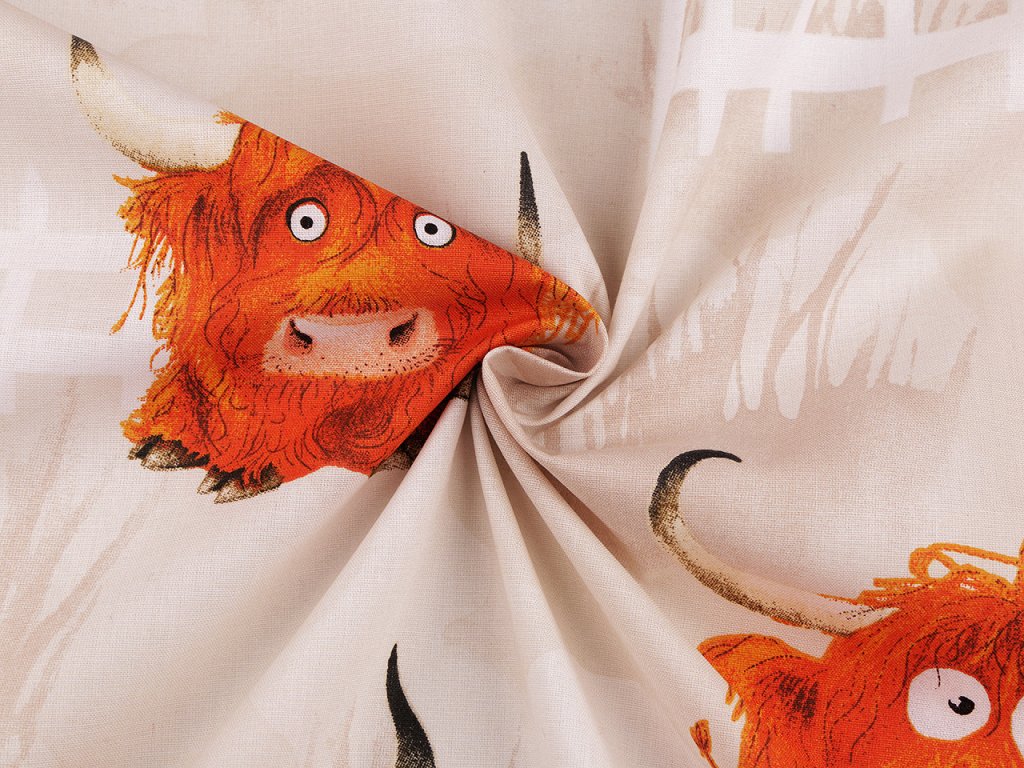 Bavlněnou látku zdobí motiv kraviček, který vám vykouzlí úsměv na tváři. Můžete z ní ušít tašky, batůžky, pytlíky, kapsáře, povlečení apod.