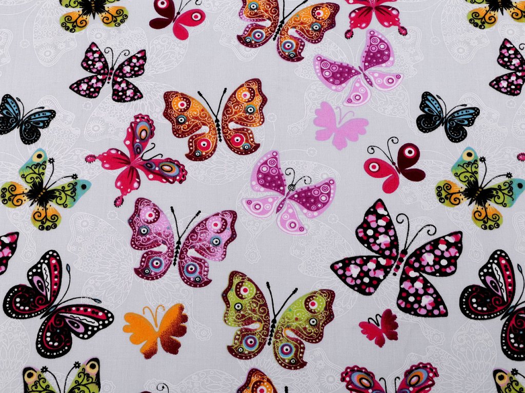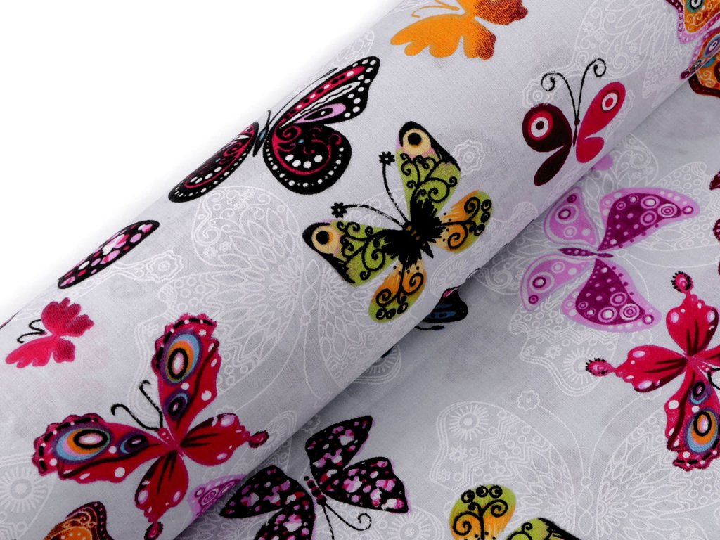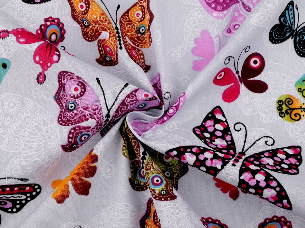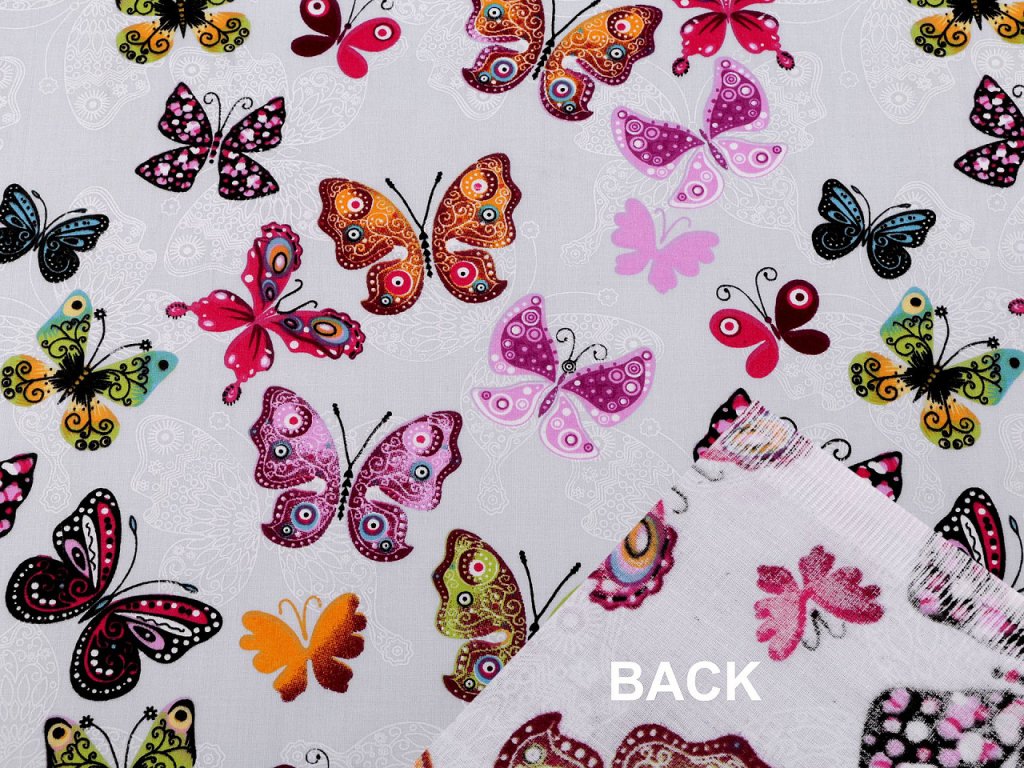 Bavlněné plátno zdobí potisk barevných motýlů. Látka je pevná, vhodná na šití polštářů, povlečení, závěsů, pytlíků, tašek, mantinelů do postýlek i hnízd pro děti.