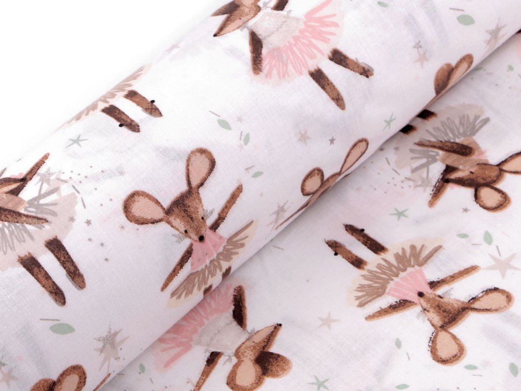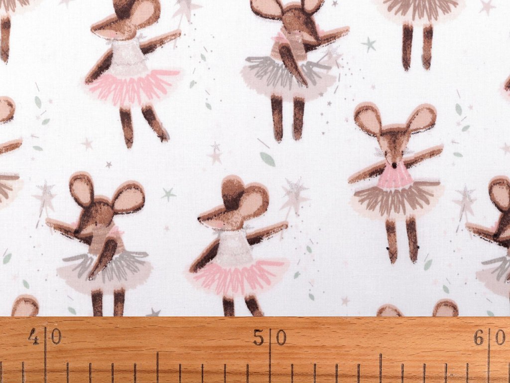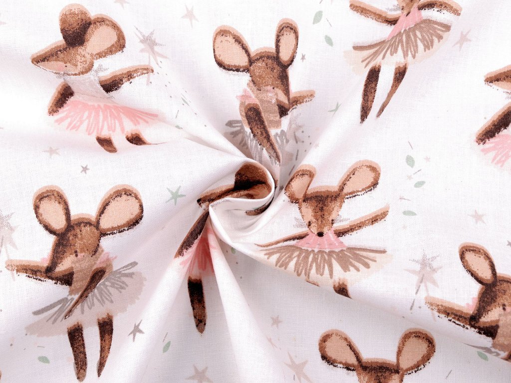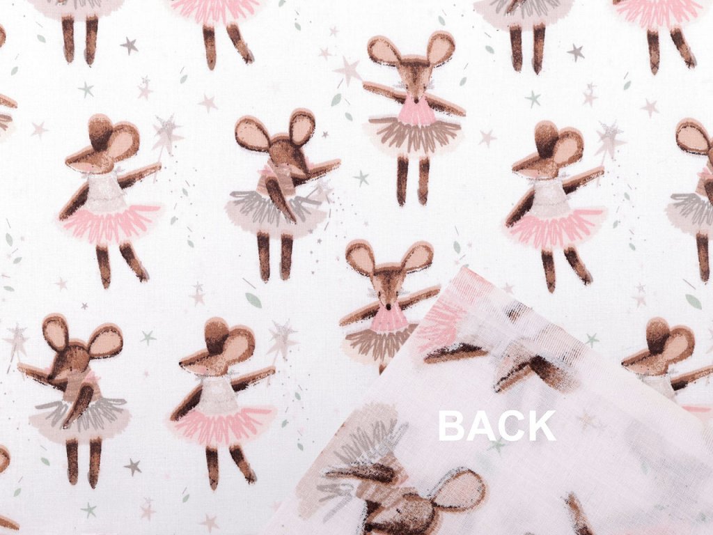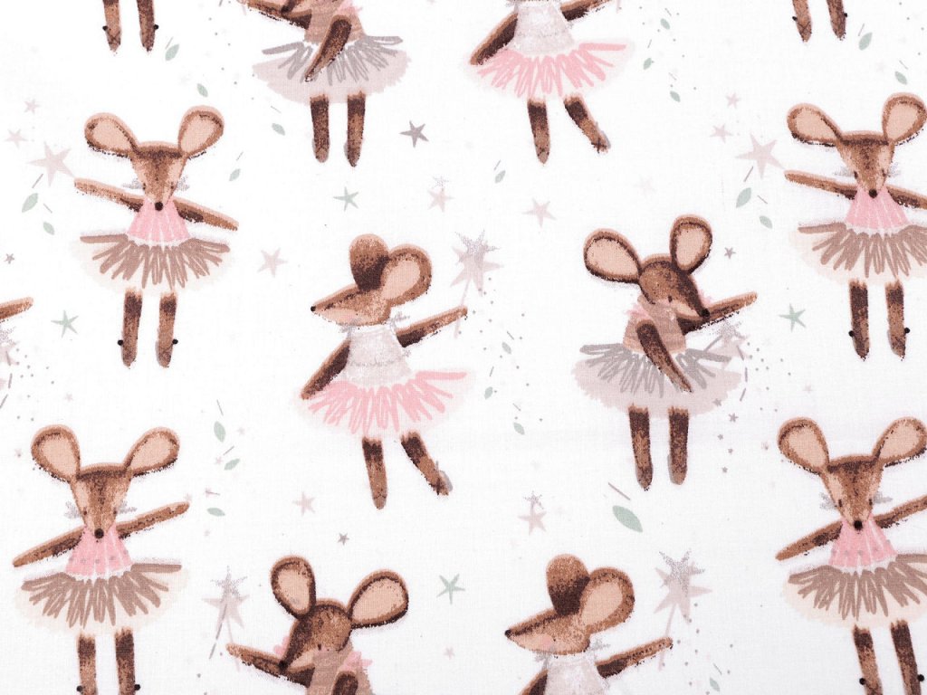 Bavlněné plátno zdobí potisk roztomilých myšek baletek. Využijete ji na šití polštářů, povlečení, závěsů, pytlíků, tašek, mantinelů do postýlek i hnízd pro děti.