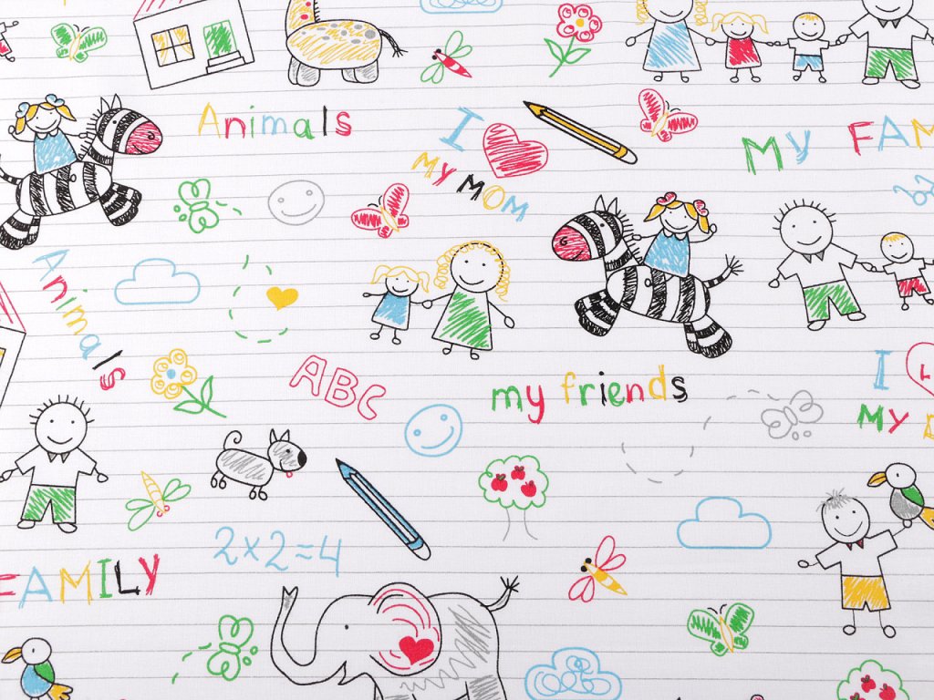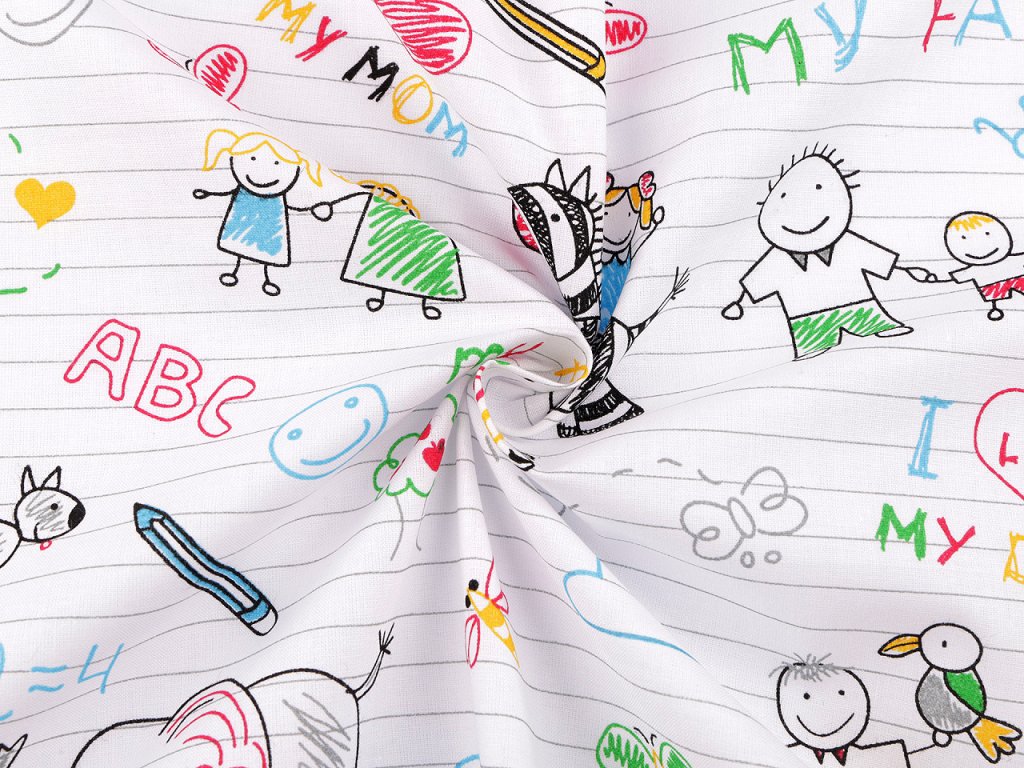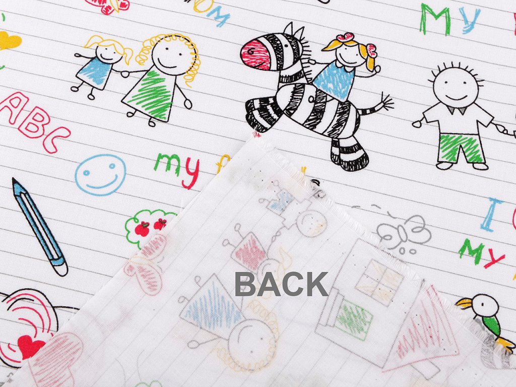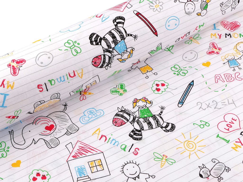 Bavlněná látka s motivem sešitu a omalovánek kombinuje praktické využití s hravým designem. Její povrch je pokrytý ilustracemi připomínajícími dětské kresby, které dodají interiéru veselý a kreativní nádech. Využijete ji na šití polštářů, dětského povlečení, závěsů, pytlíků nebo kapsářů. Může sloužit jako inspirace pro dětské tvoření. Je také vhodná pro výrobu praktických doplňků, jako jsou tašky nebo obaly na knihy.