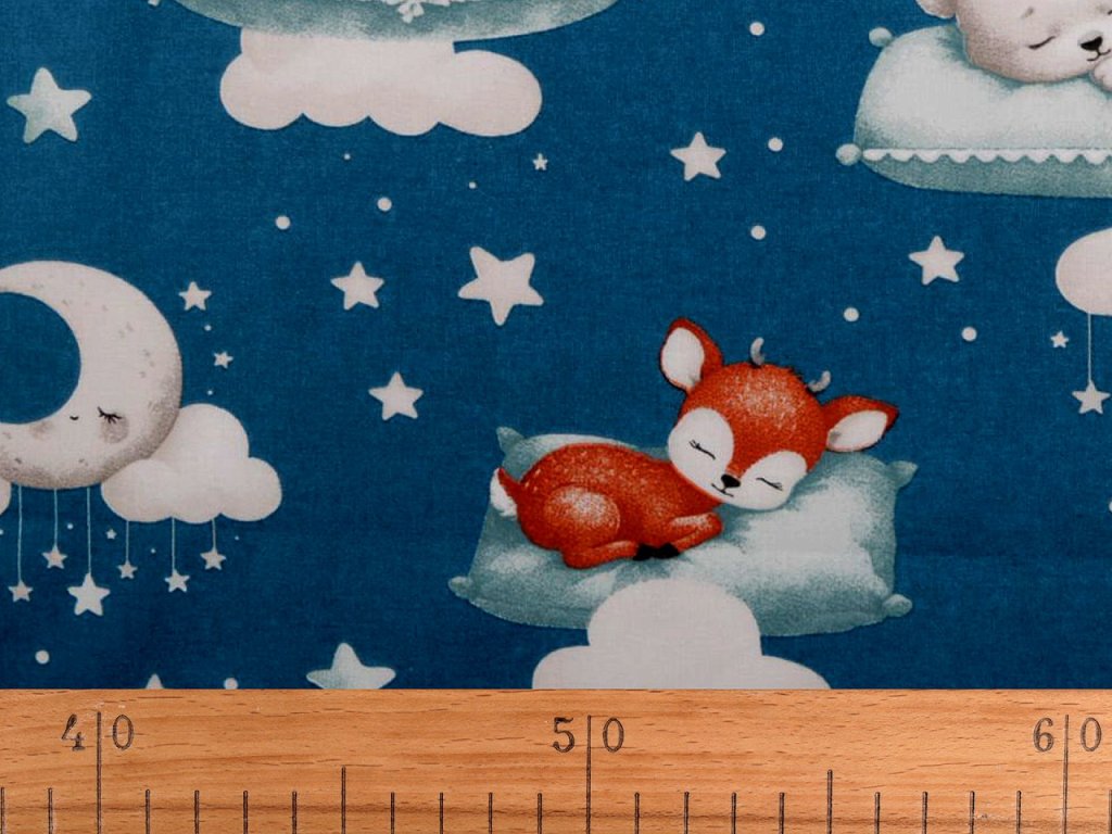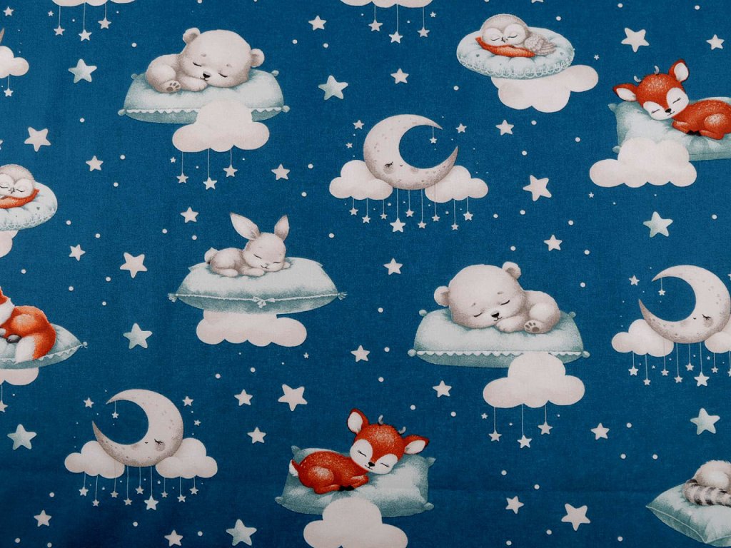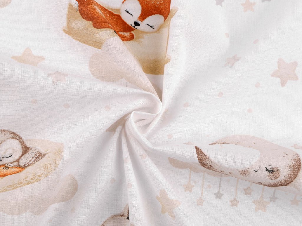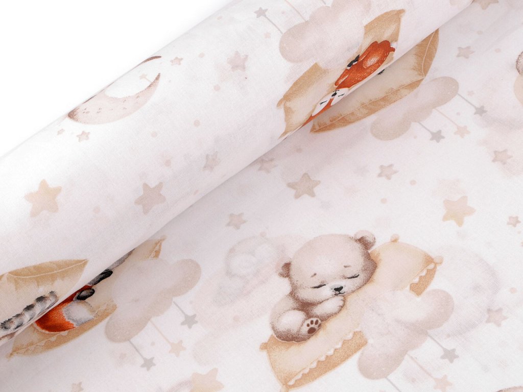 Bavlněná látka je vhodná na šití polštářů, dětského povlečení, závěsů, pytlíků, tašek nebo kapsářů. Zdobí ji obrázky spících zvířátek.