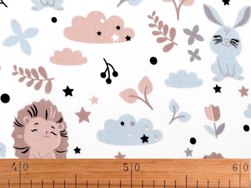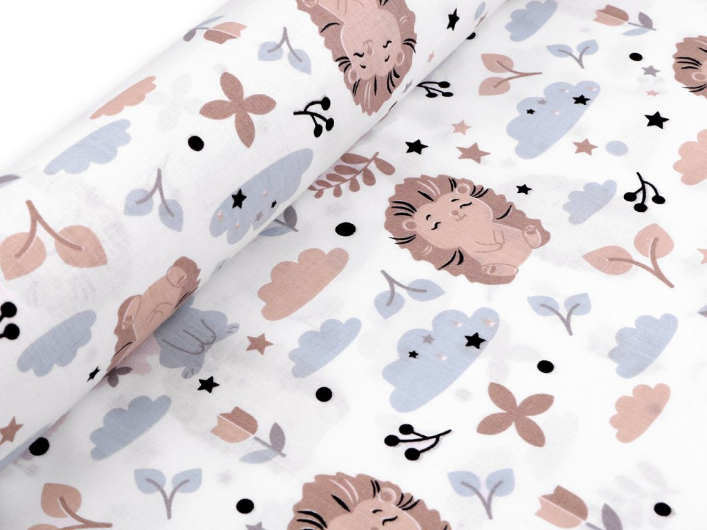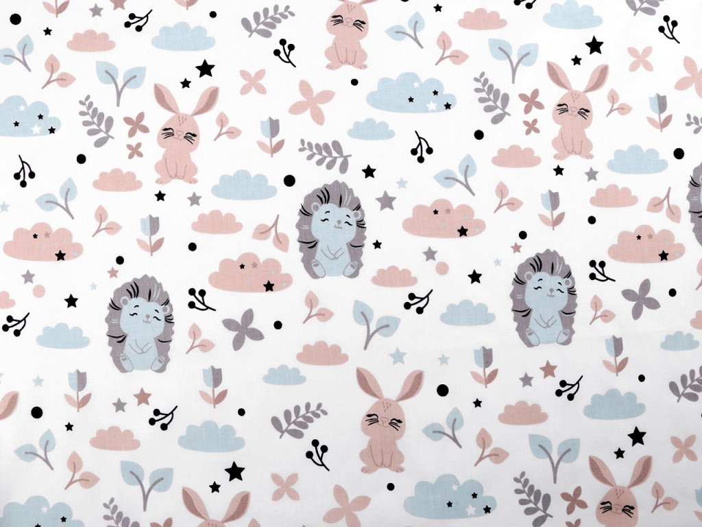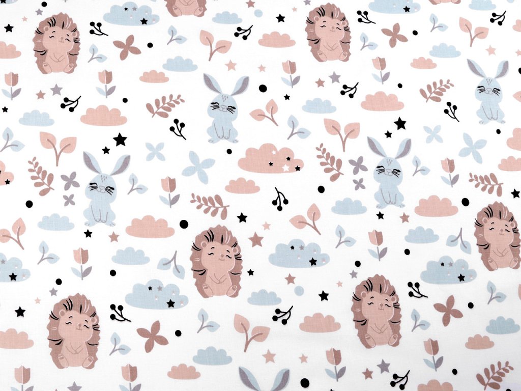 Bavlněná látka s motivy zvířátek je vhodná na šití polštářů, dětského povlečení, závěsů, pytlíků, tašek, mantinelů do postýlek i hnízd pro děti.