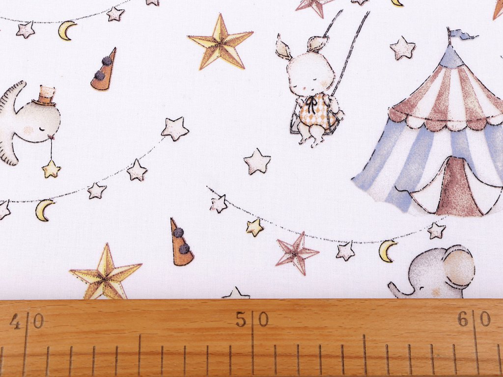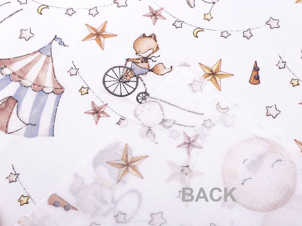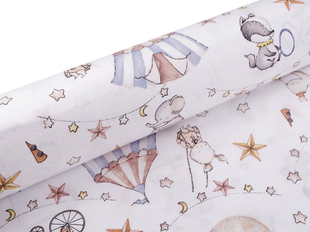 Bavlněná látka s roztomilými zvířátky v cirkusovém prostředí je vhodná na šití polštářů, povlečení, mantinelů do postýlek, kapsářů, tašek, pytlíků apod.