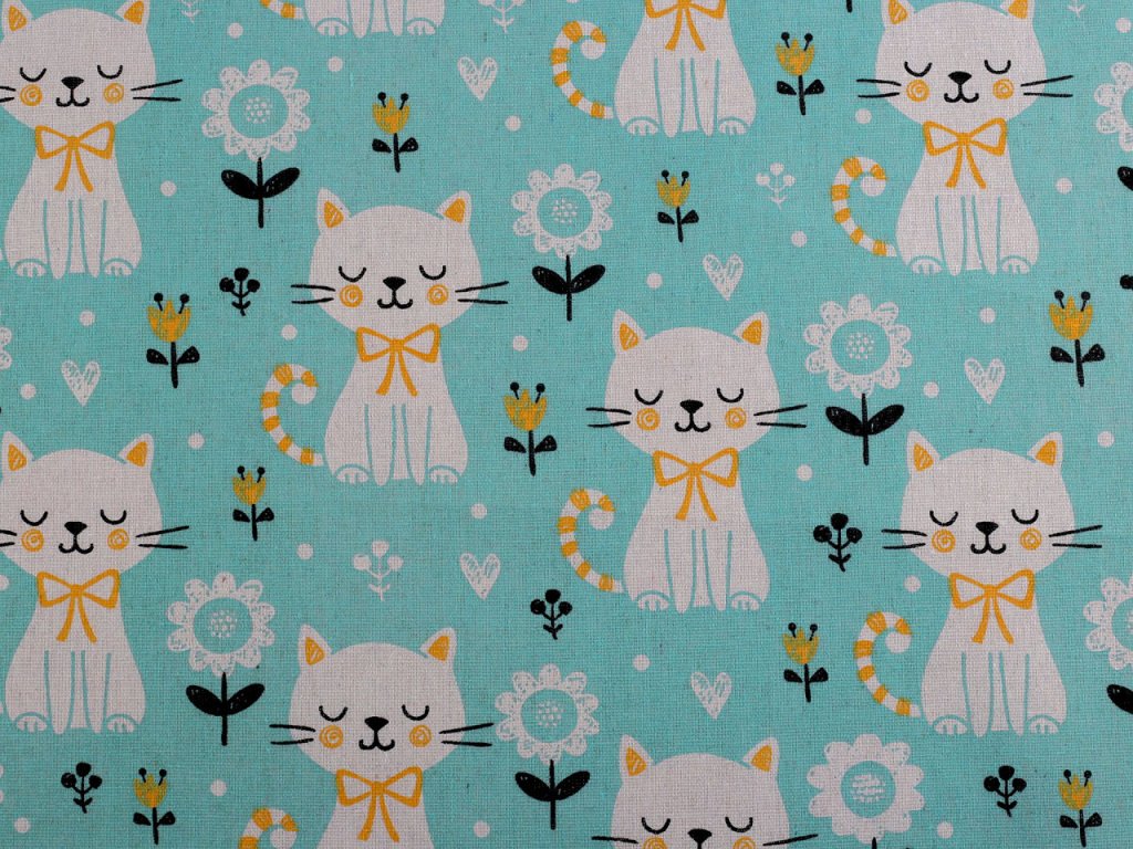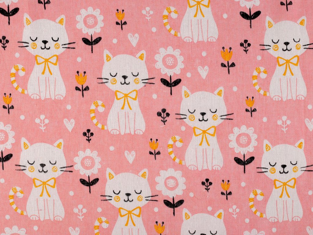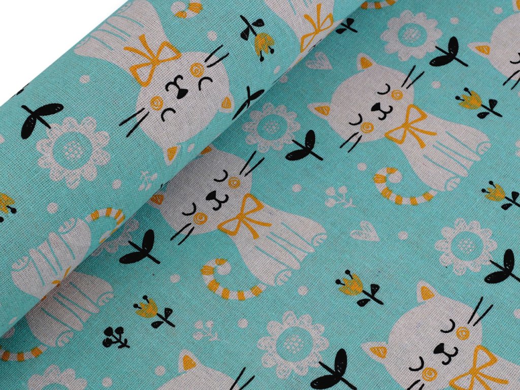 Bavlněná látka s potiskem koček je hrubší, pevná, vhodná na šití tašek, ubrusů, běhounů, prostírání, dekoračních polštářů, dětských teepee apod. Svou plátnovou vazbou připomíná len.