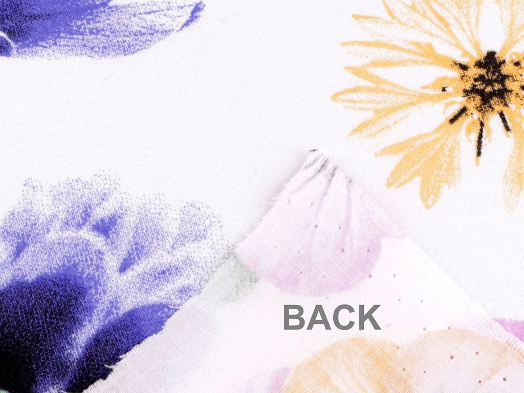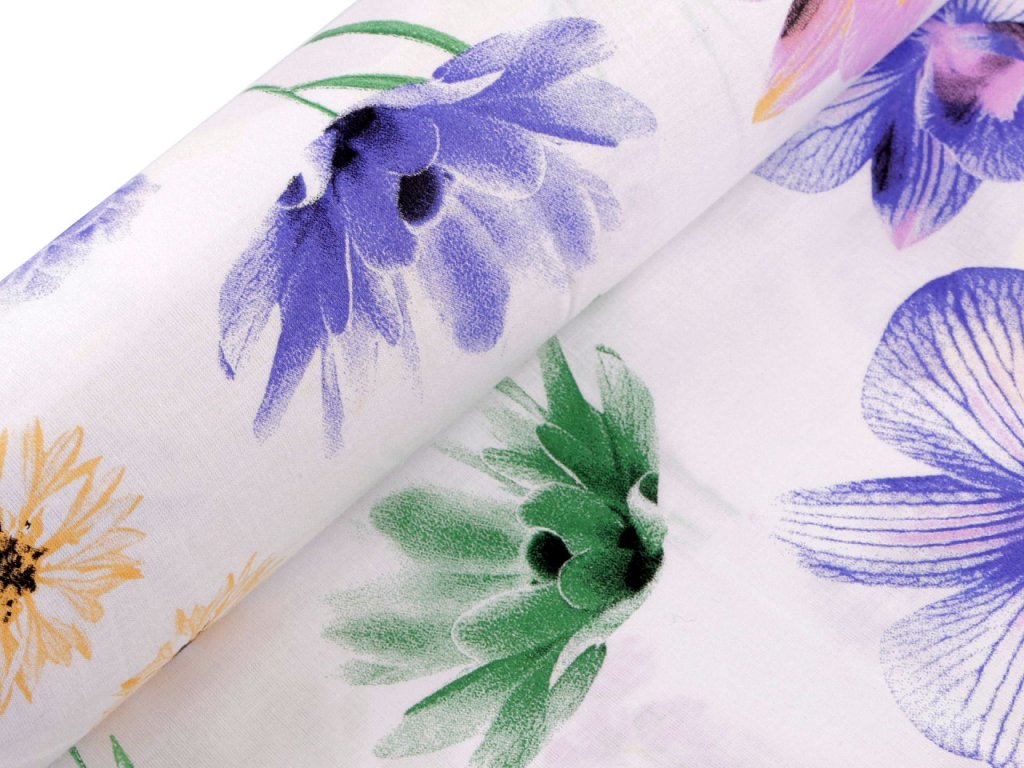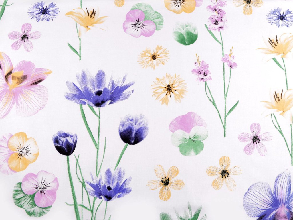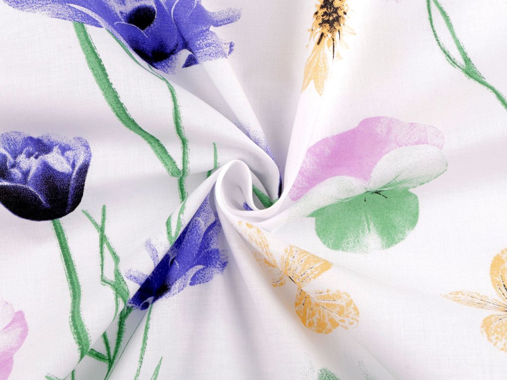 Bavlněnou látku zdobí jemný květinový potisk. Hodí se na šití povlečení, polštářů, závěsů, ubrusů, tašek, pytlíků a různých bytových dekorací a doplňků.