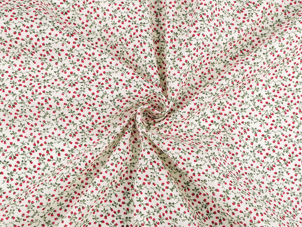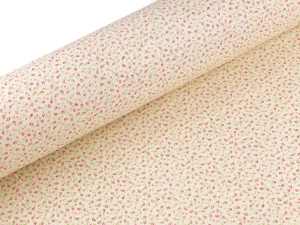 Bavlněnou látku využijete na šití polštářů, povlečení, závěsů, ubrusů, tašek, pytlíků, zástěr apod. Je měkká a příjemná na dotek, zdobí ji potisk drobných květinek.