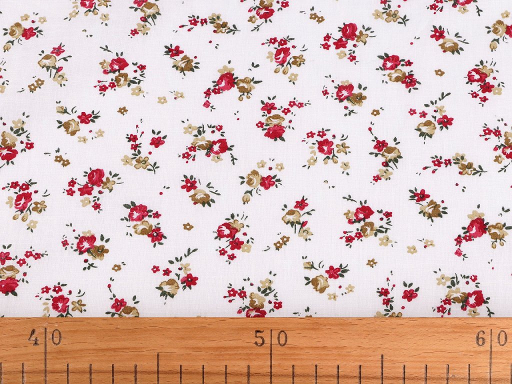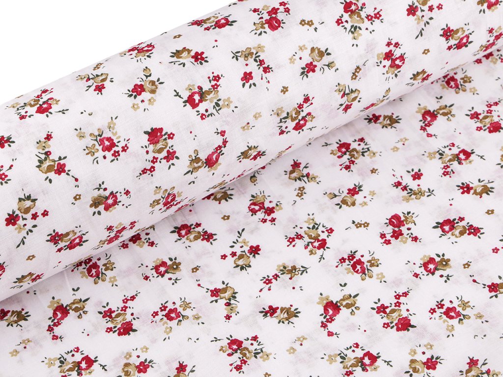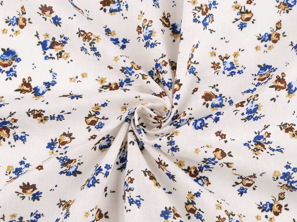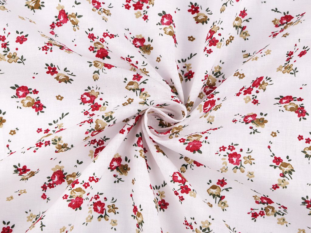 Bavlněná látka s potiskem drobných květin je měkká a příjemná na dotek. Využijete ji na šití polštářů, závěsů, ubrusů, tašek, pytlíků, zástěr apod.