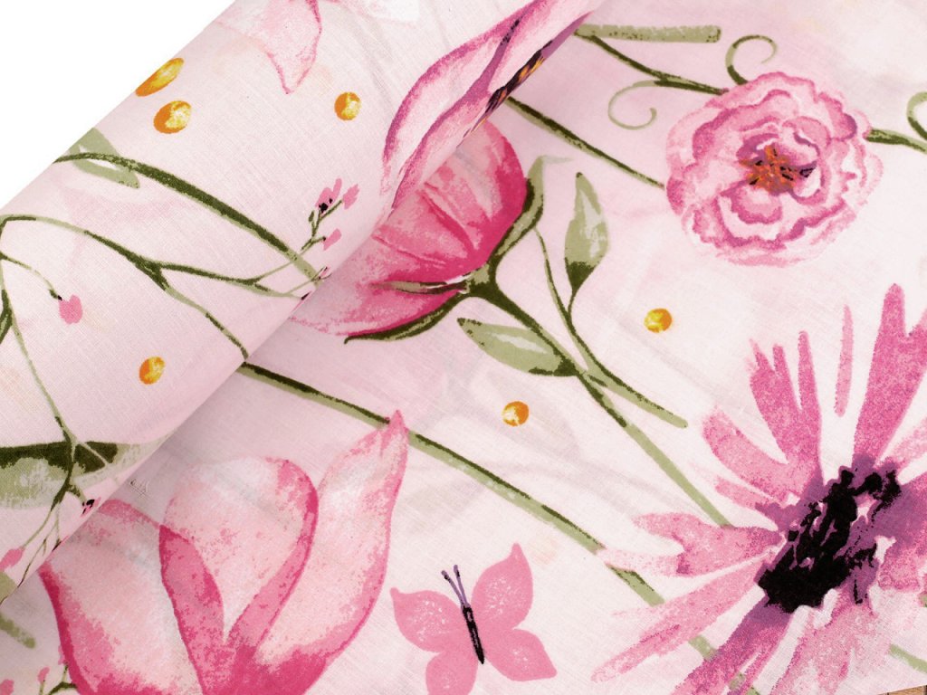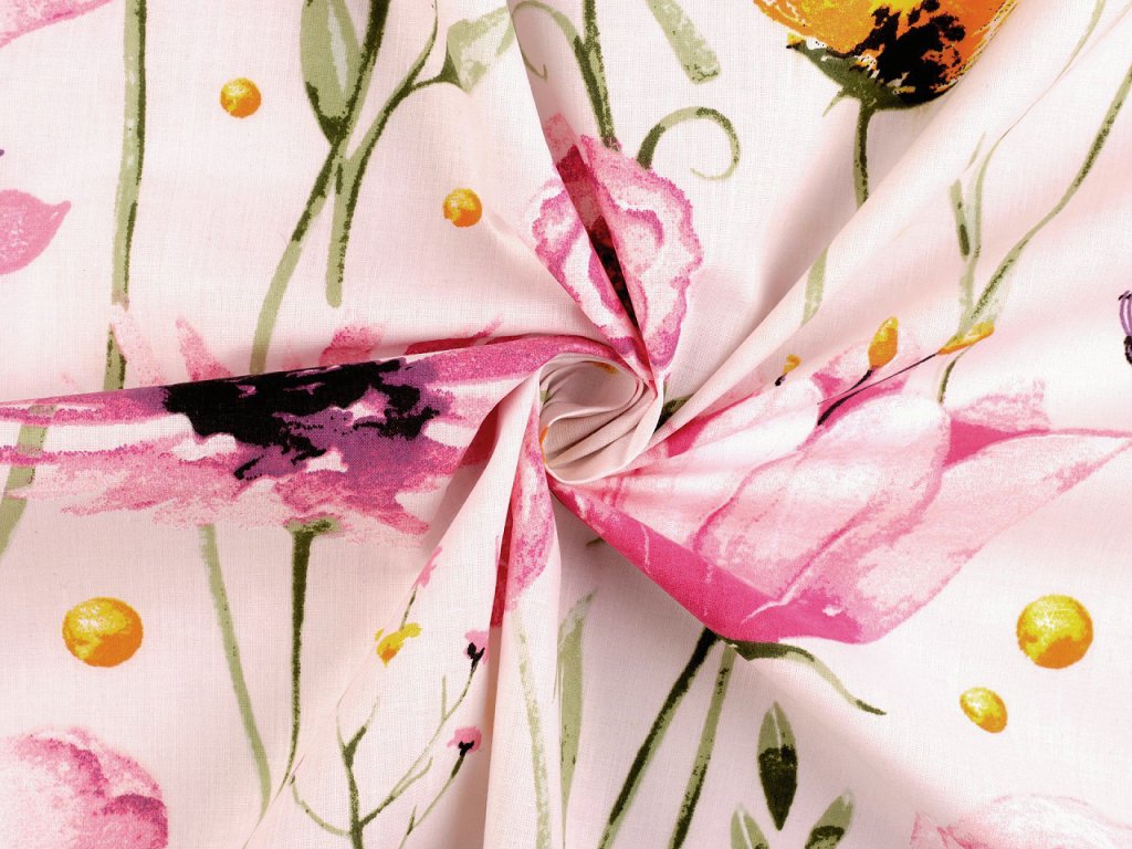 Bavlněná látka s velkými květy vynikne na povlečení, ubrusech, polštářích, ale můžete z ní ušít i tašky, pytlíky apod.