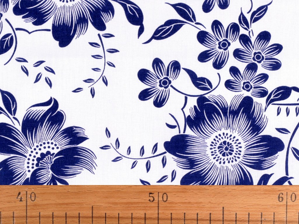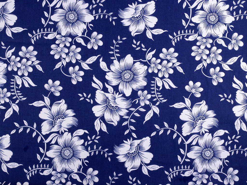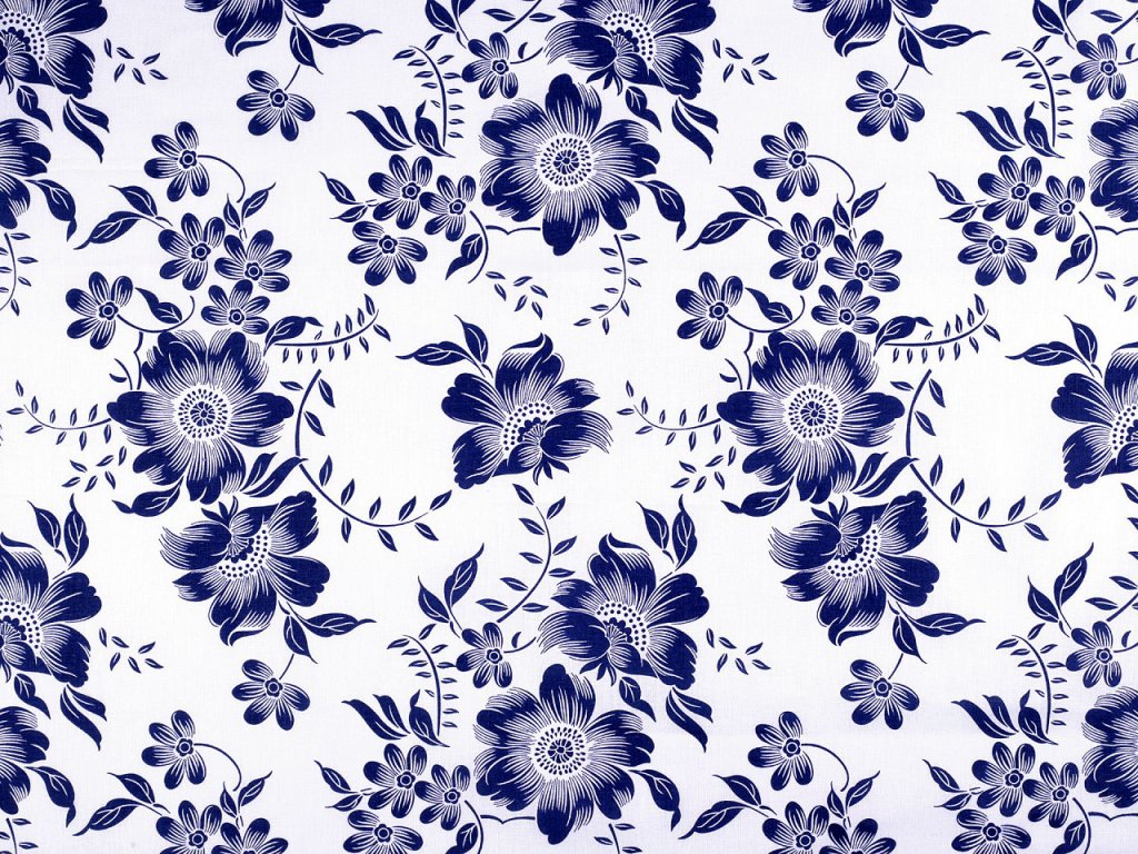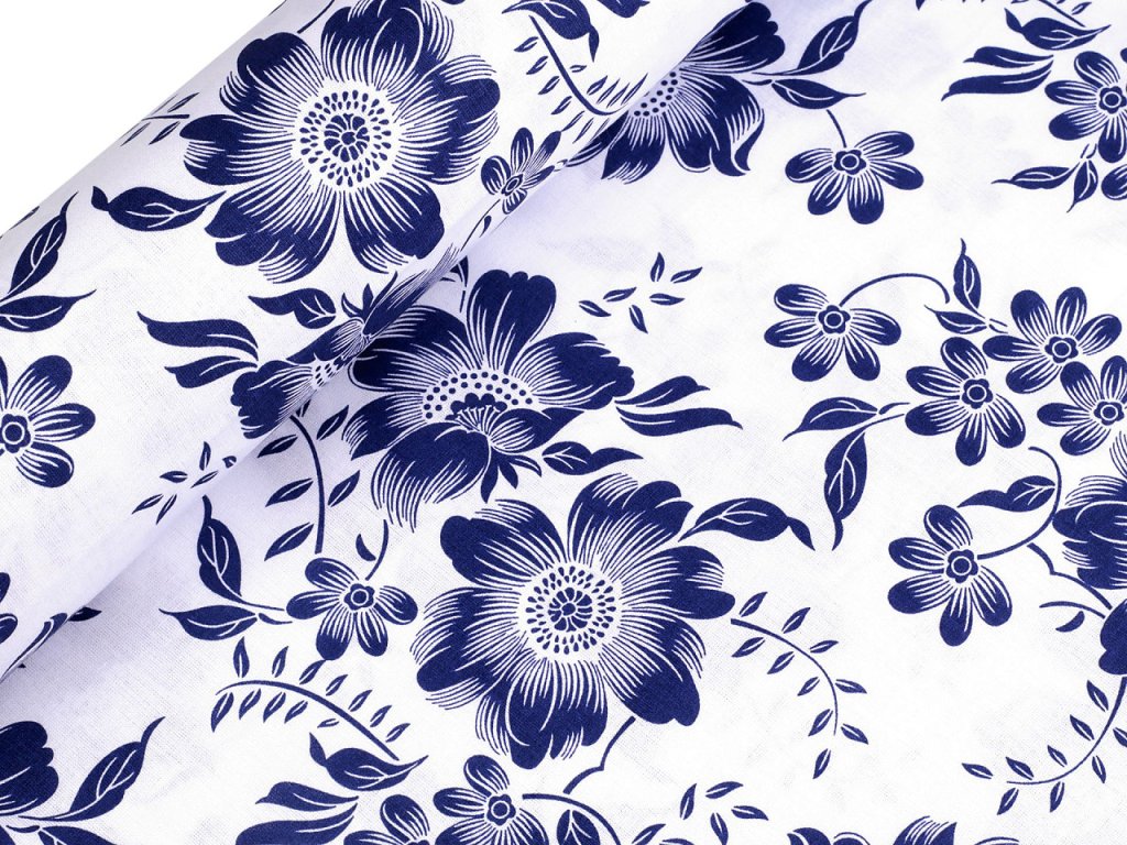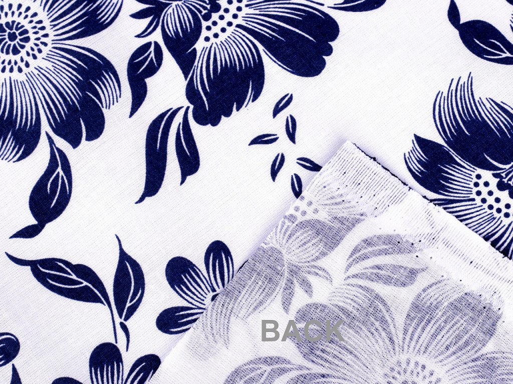 Bavlněné plátno zdobí potisk květů. Připomíná tzv. modrotisk. Hodí se na šití ubrusů, prostírání, závěsů, tašek, pytlíků, povlečení apod.