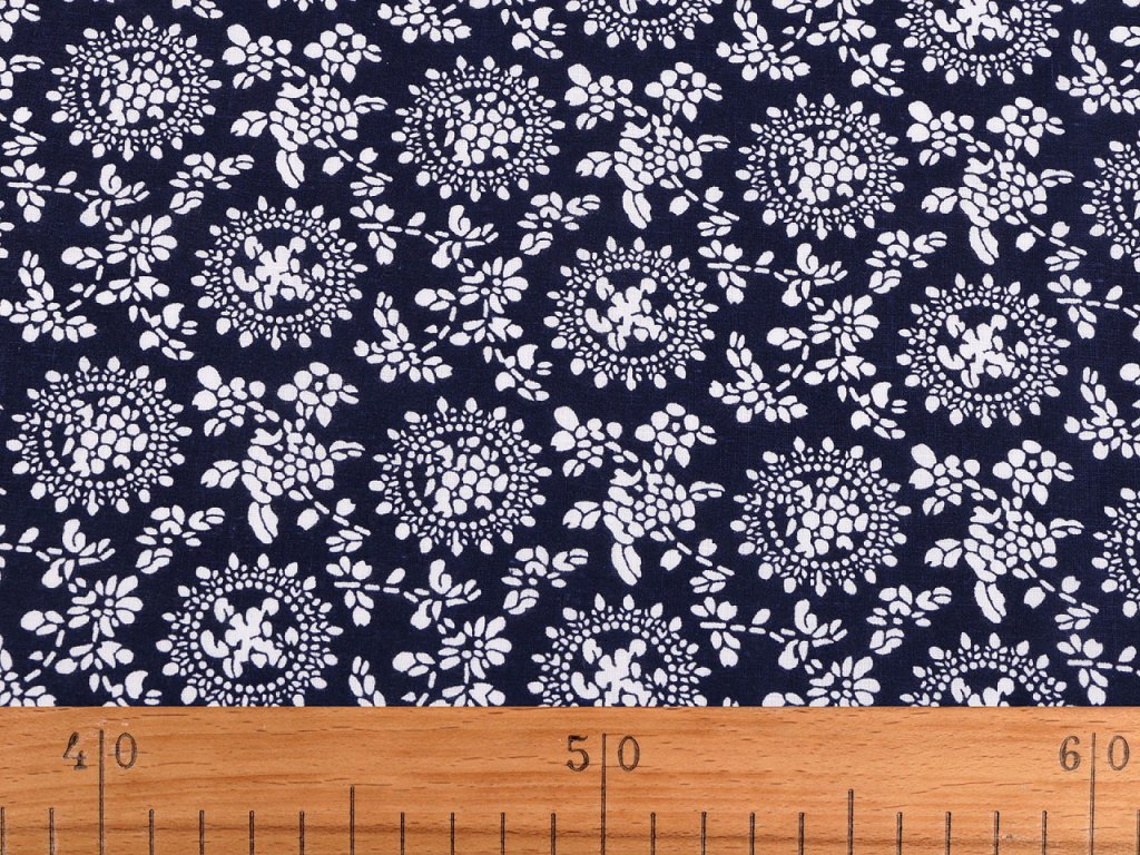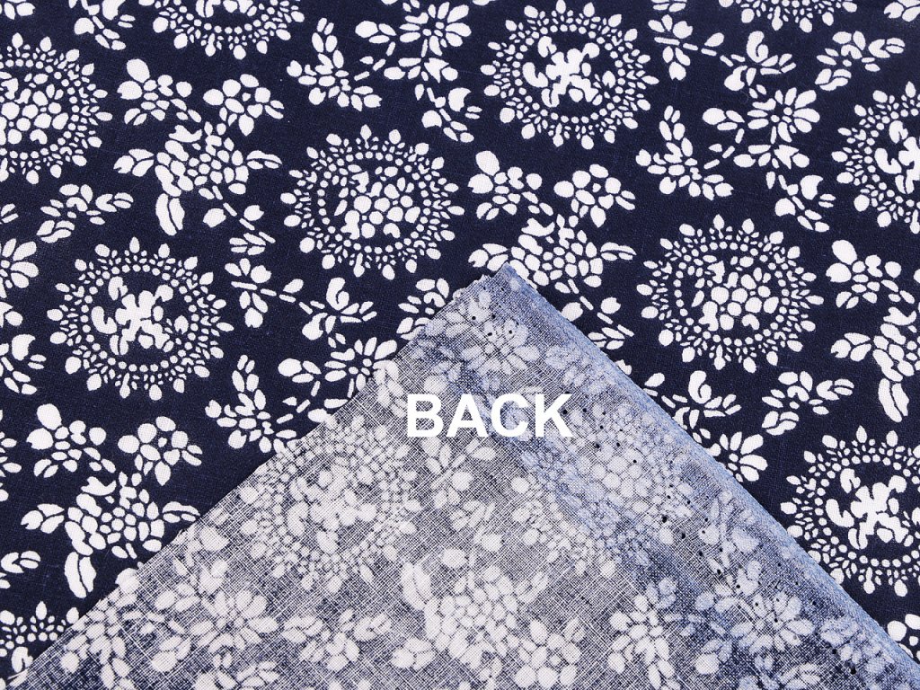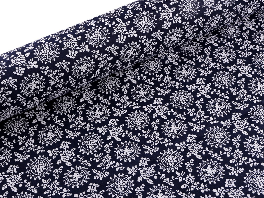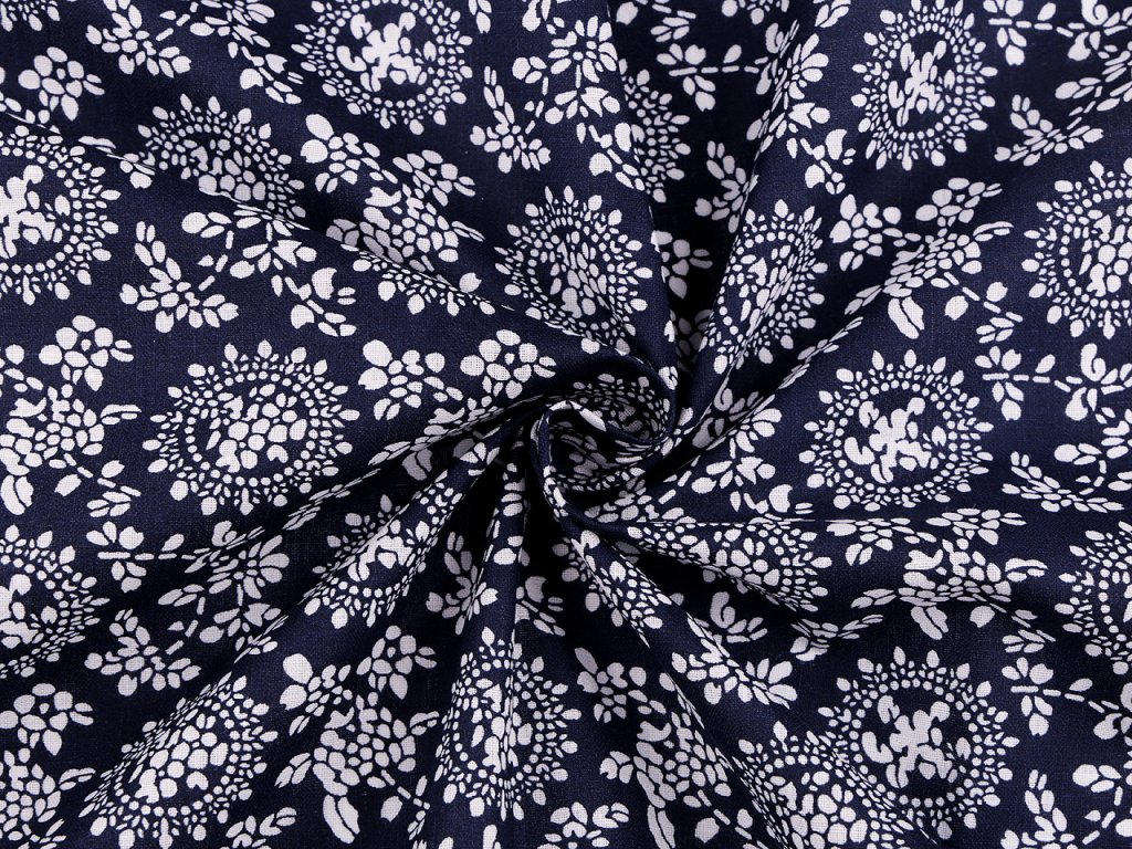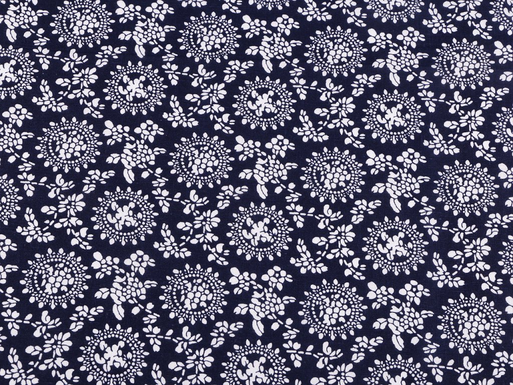 Bavlněnou látku zdobí potisk, který připomíná tzv. modrotisk. Hodí se na šití ubrusů, prostírání, závěsů, tašek, pytlíků, povlečení apod.
