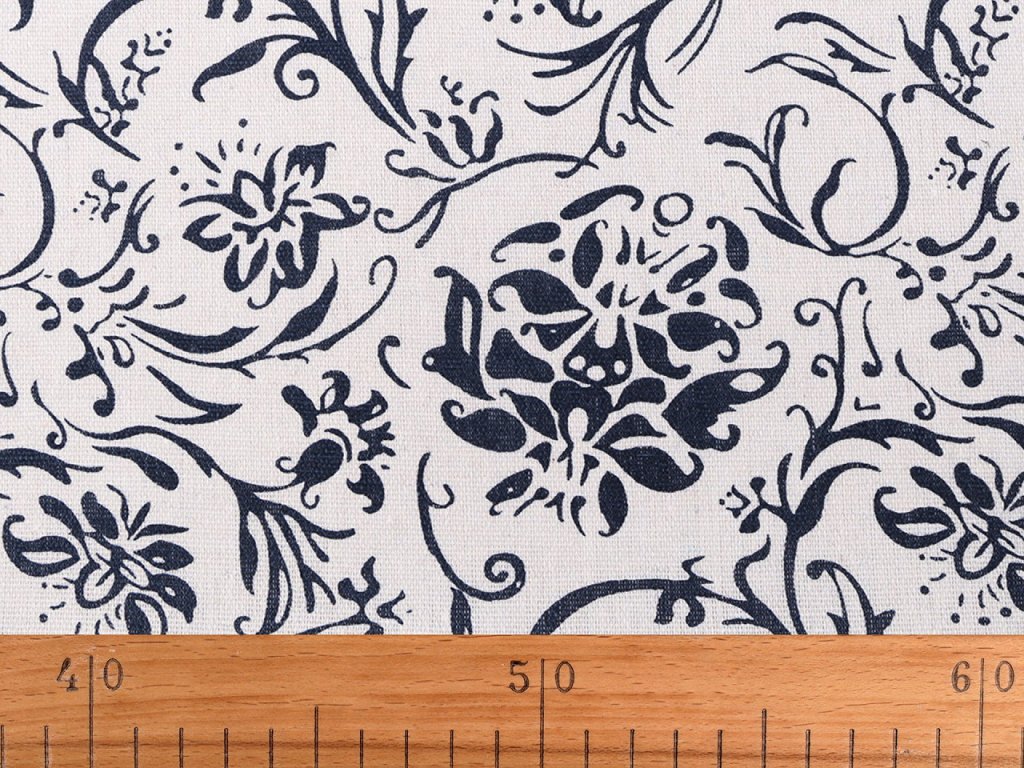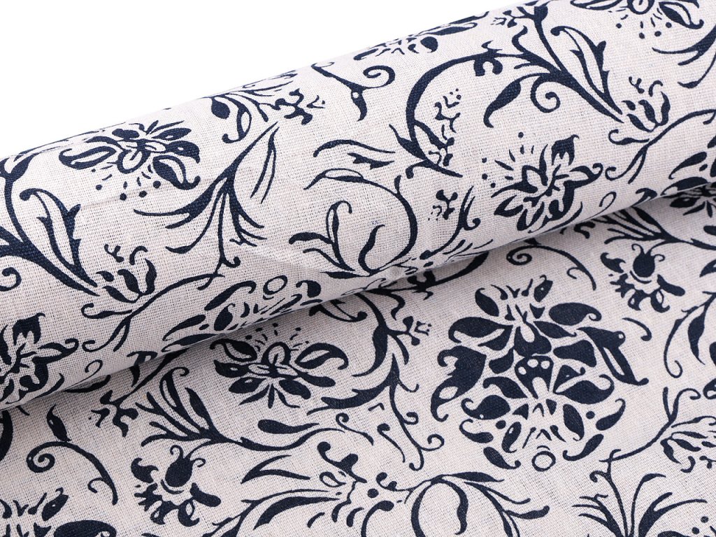 Látku imitující len zdobí květinové motivy. Využijete ji na šití ubrusů, běhounů, prostírání, dekoračních polštářů, tašek, dětských teepee apod.