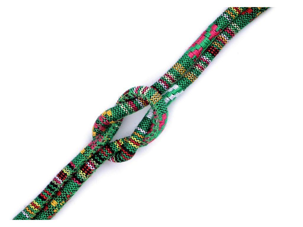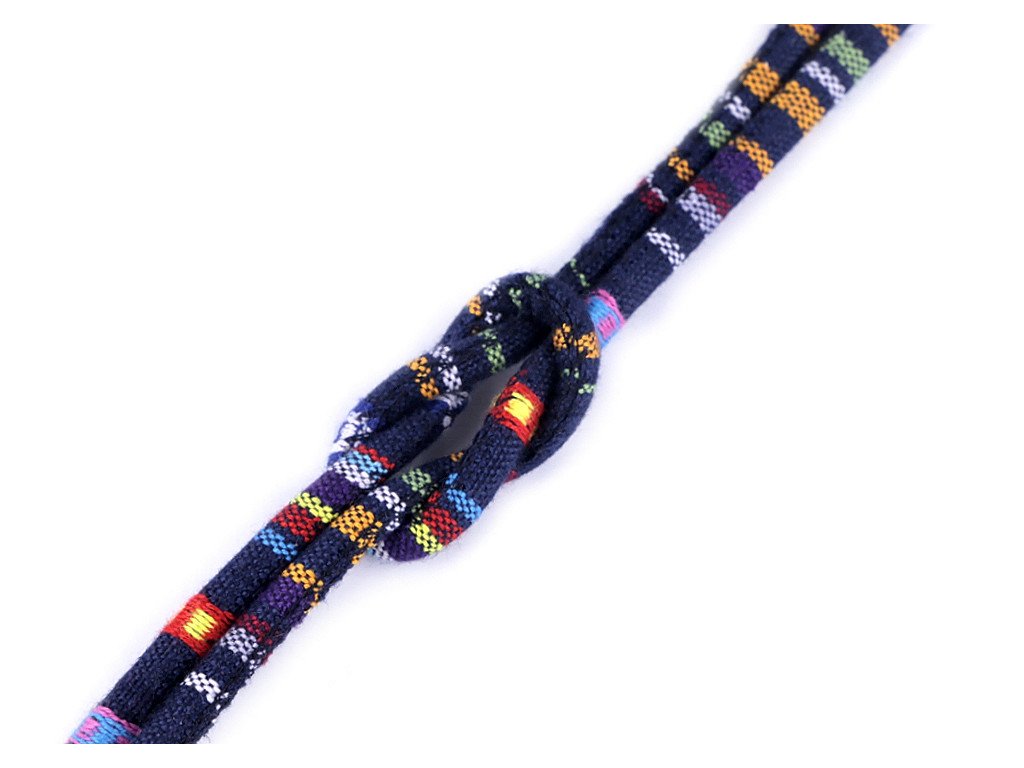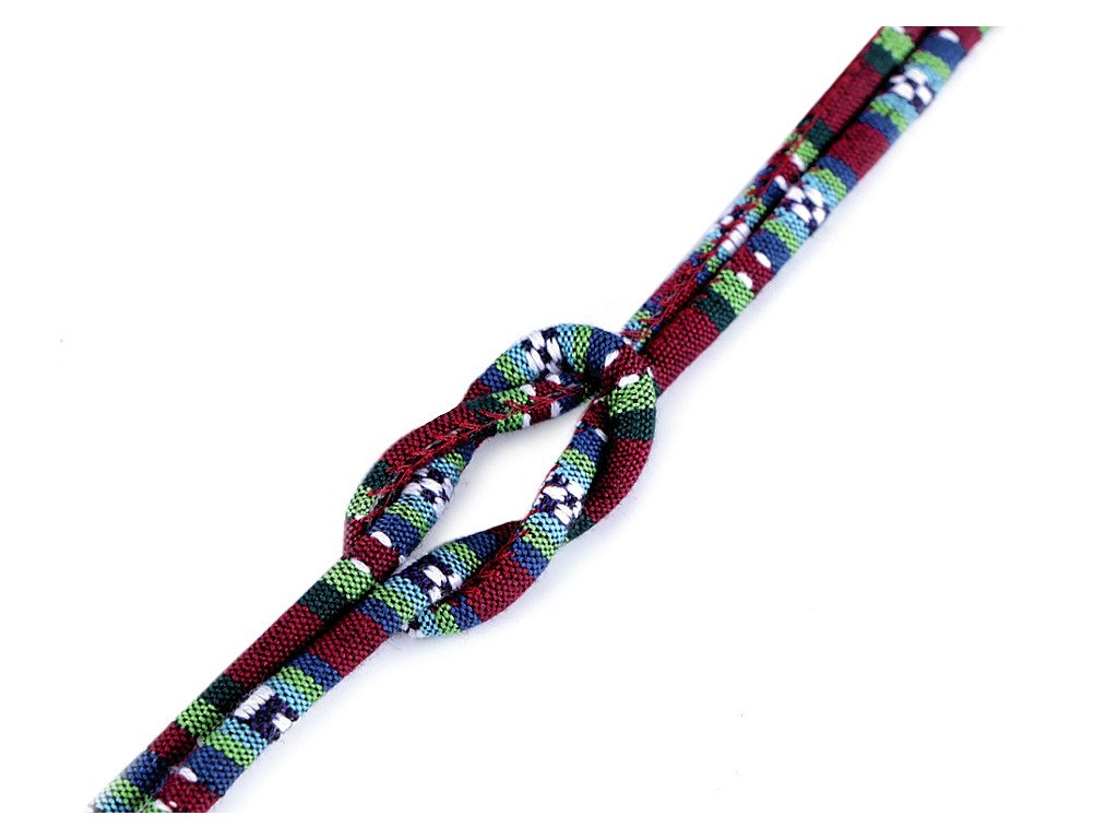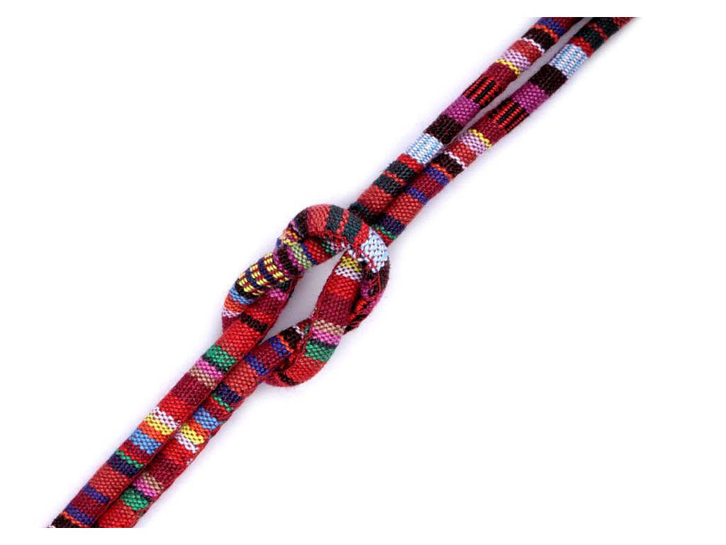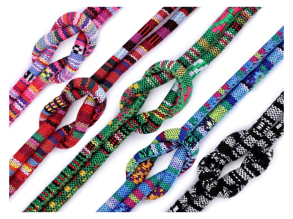 Barevnou šňůru s indiánským motivem a výplní využijete do tunýlků mikin, kalhot nebo bund, nebo jako nevšední ozdobu oděvů či obuvi. Vytvoříte z něj jednoduchý trendy pásek, náhrdelník či náramek. Šňůra je pevná, skvěle se tak uplatní při výrobě vaků na záda nebo tašek.