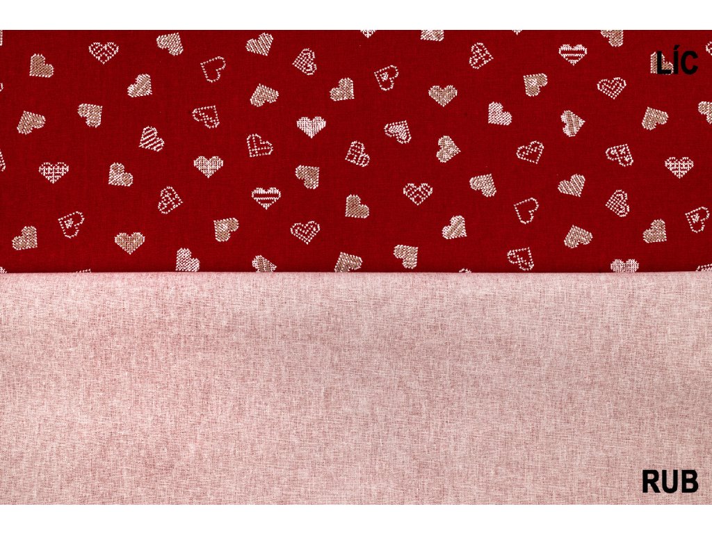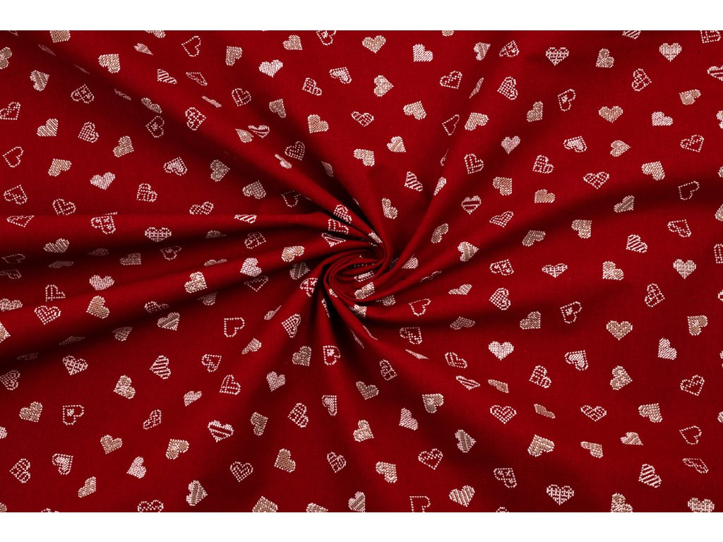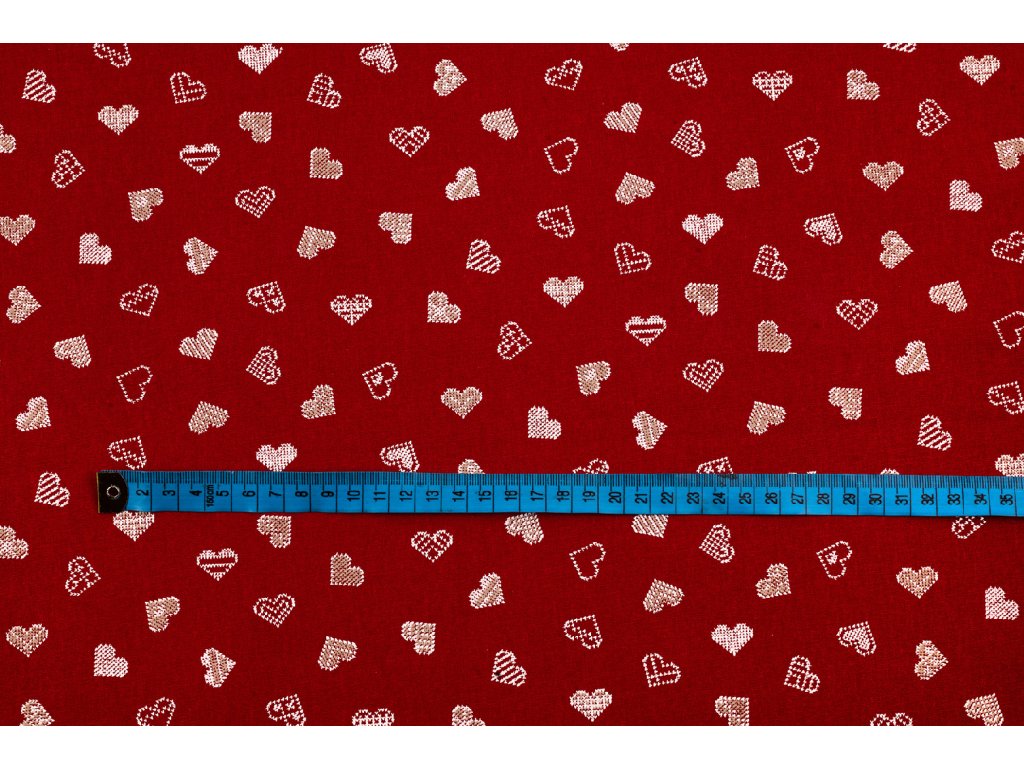 Bavlněné plátno drobné „vyšívané“ srdce bílé s béžovou na červené