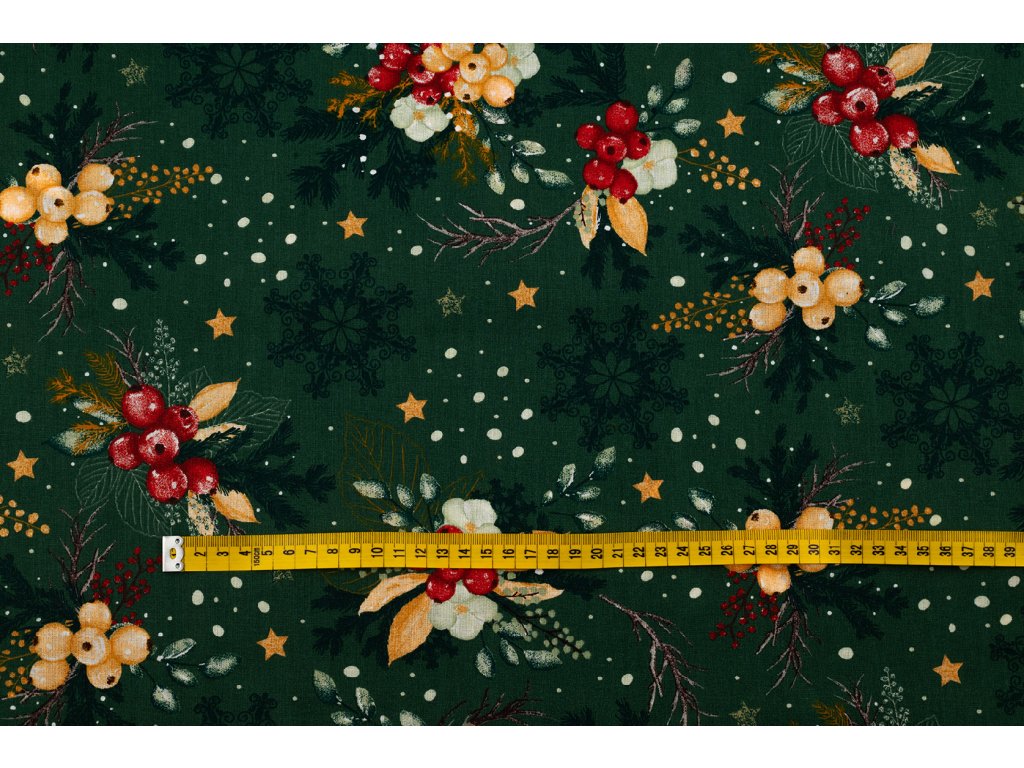 Bavlněné plátno vánoční dekorace s vločkami na zelené