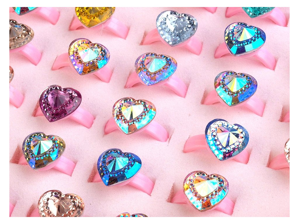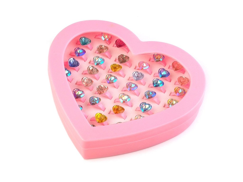 Mix dětských prstýnků je zabalený v plastové srdcové kazetě, která má průhledné plastové víko. Je ideální na prodejní prezentaci. Prsteny jsou ozdobené plastovým kamenem, který v dětských očích vypadá jako zářivý drahokam.