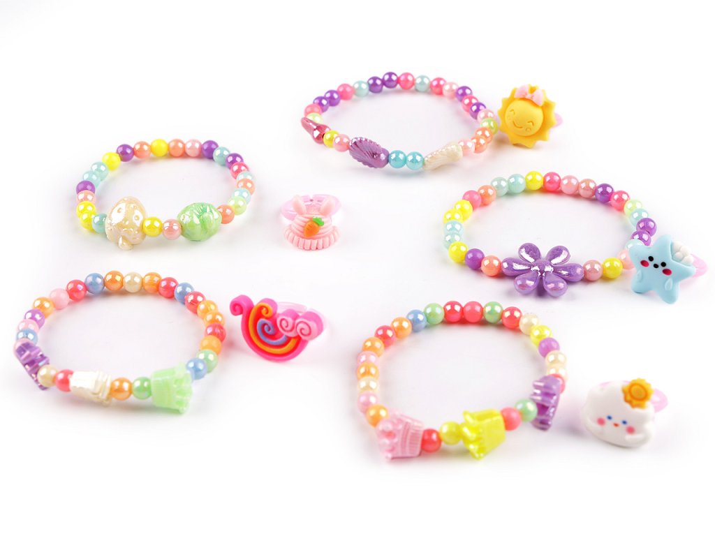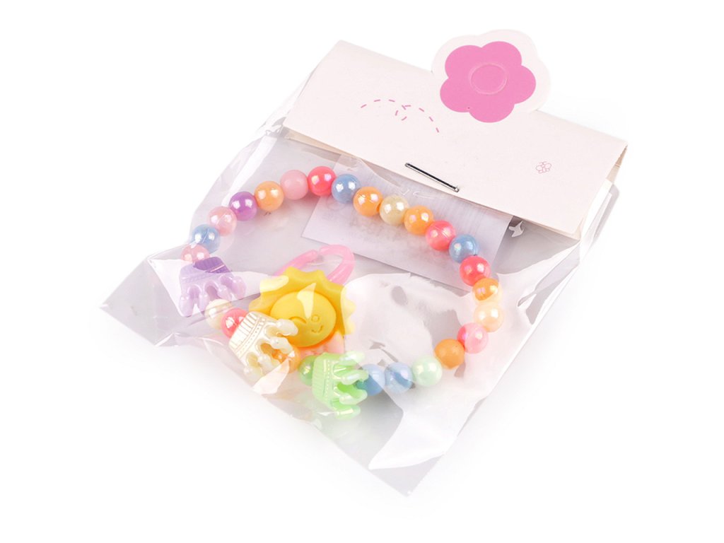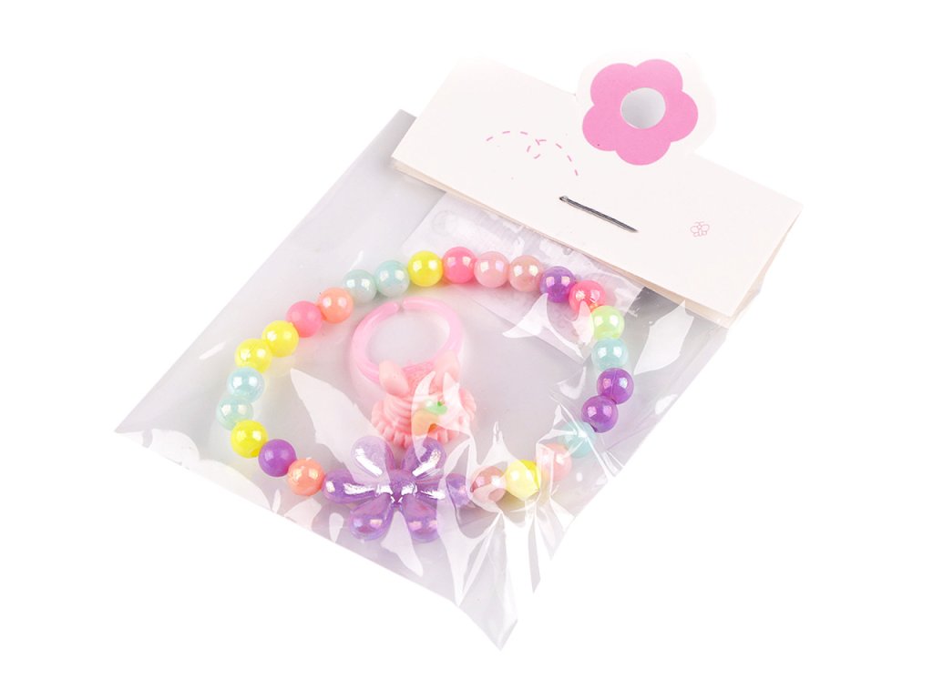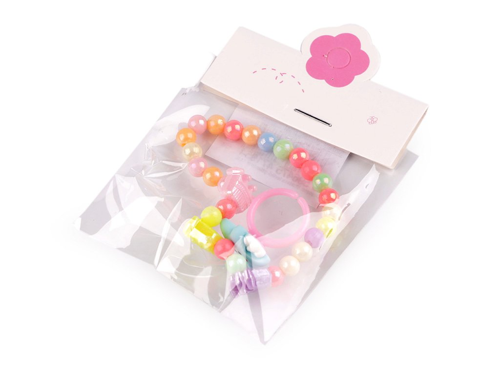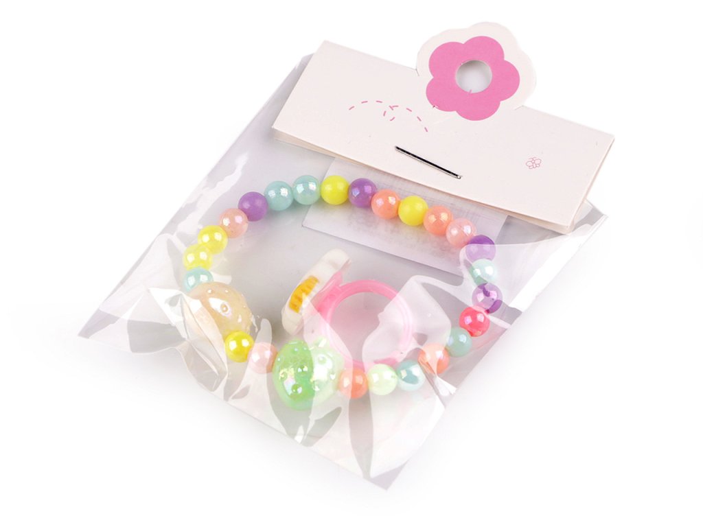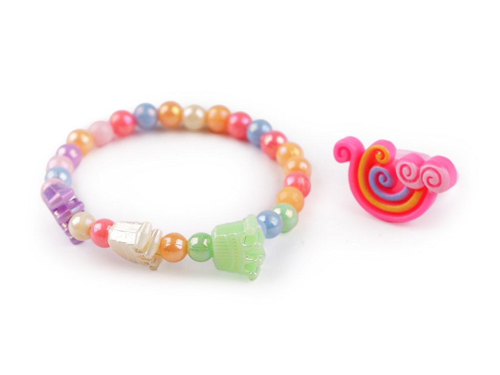 Lesklé korálky na náramku jsou navlečené na pružné gumičce. Náramek je ozdobený většími korálky s různým motivem. Ozdoba na prstýnku je 3D, zadní strana prstýnku je otevřená, má univerzální velikost určenou pro drobné dětské prsty. Náramek nemá uzávěr, je pružný, jde pohodlně navléci.