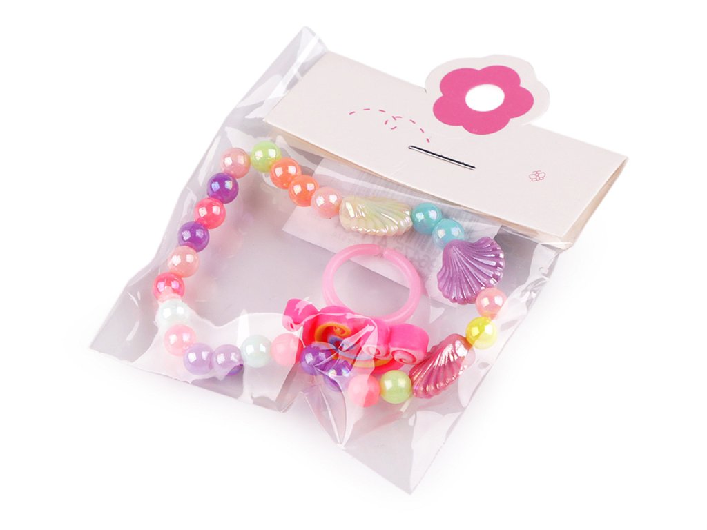 Dětská sada roztomilých šperků z plastových korálků s perlovým leskem obsahuje náramek a prstýnek.