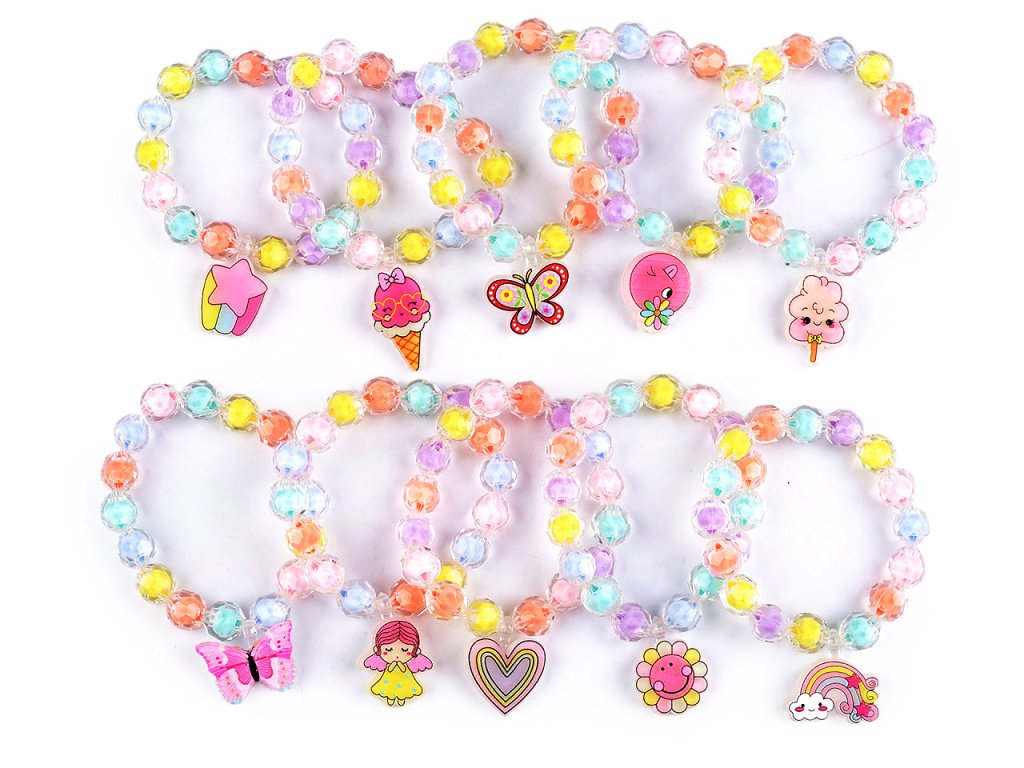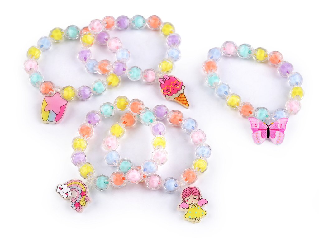 Náramek je vyrobený z plastových korálků navlečených na pružné gumičce. Pohodlně se navléká na ruku. Ozdoba je plochá, má různý motiv.