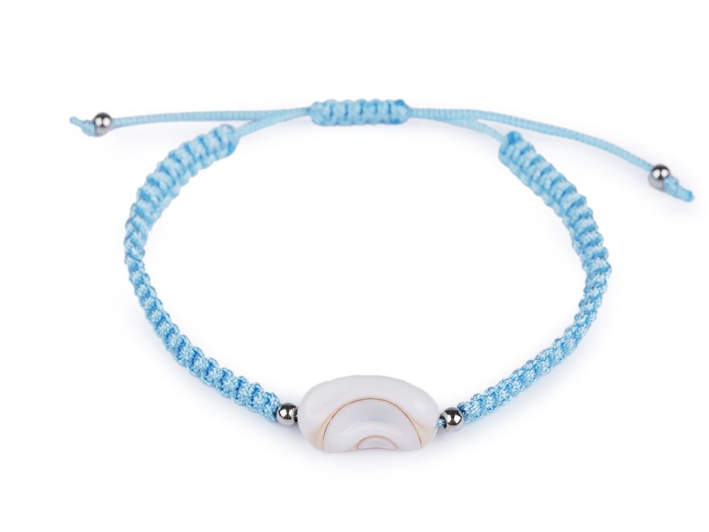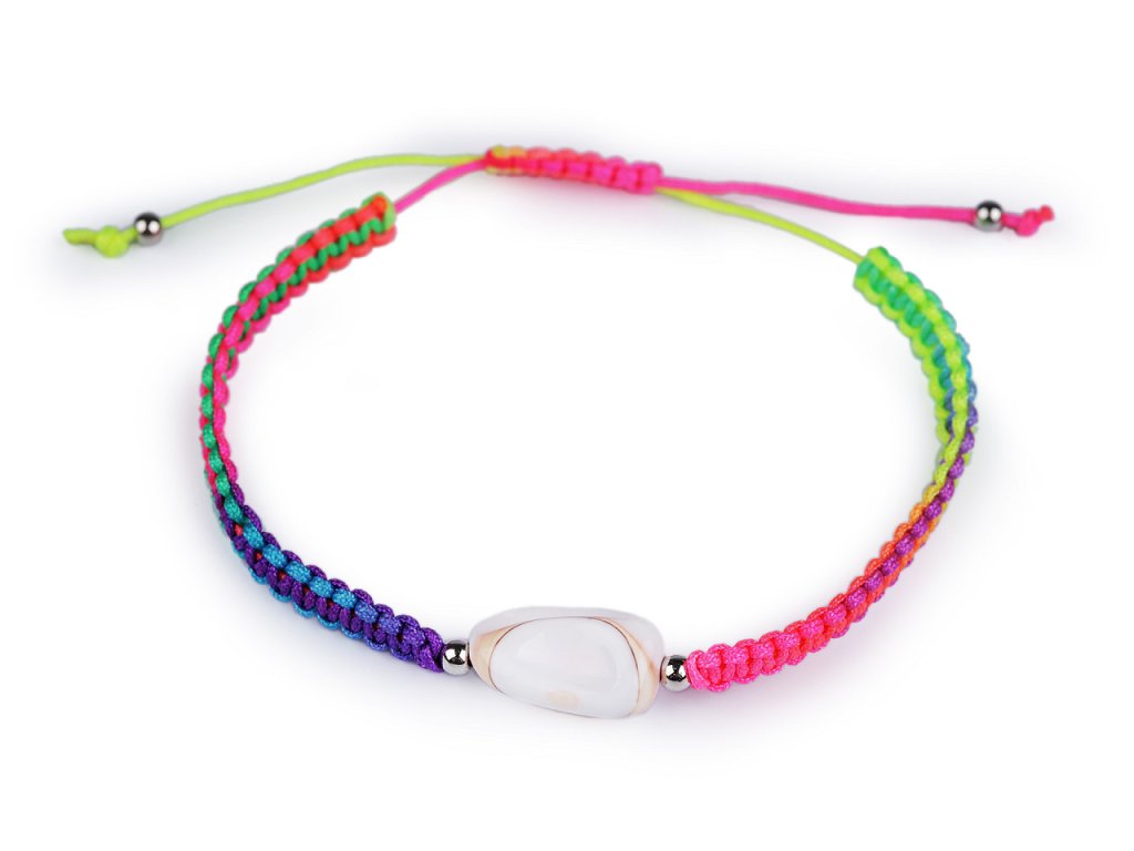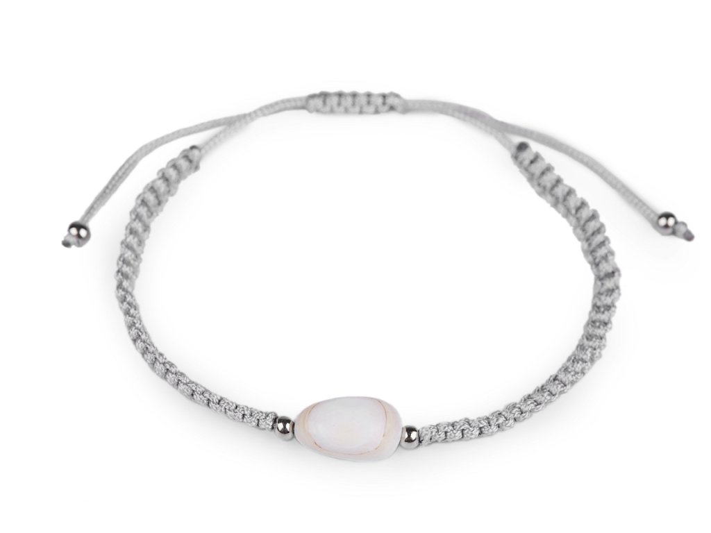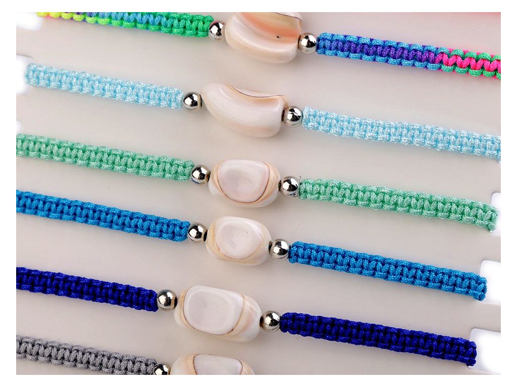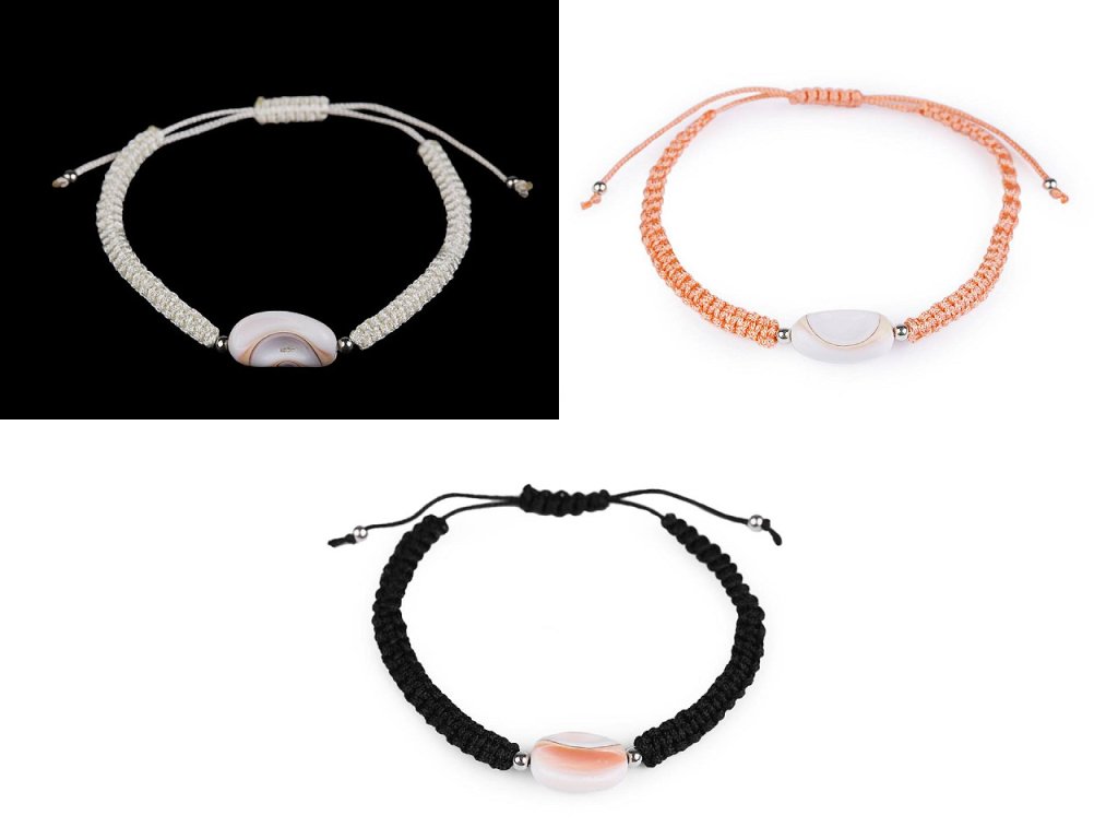 Na macramé šňůrky je doprostřed připevněná mušle a stříbrné plastové korálky. Zapínání je posuvné, oba konce náramku procházejí středovým uzlem, který umožňuje utažení šňůrek. Náramek má univerzální velikost.