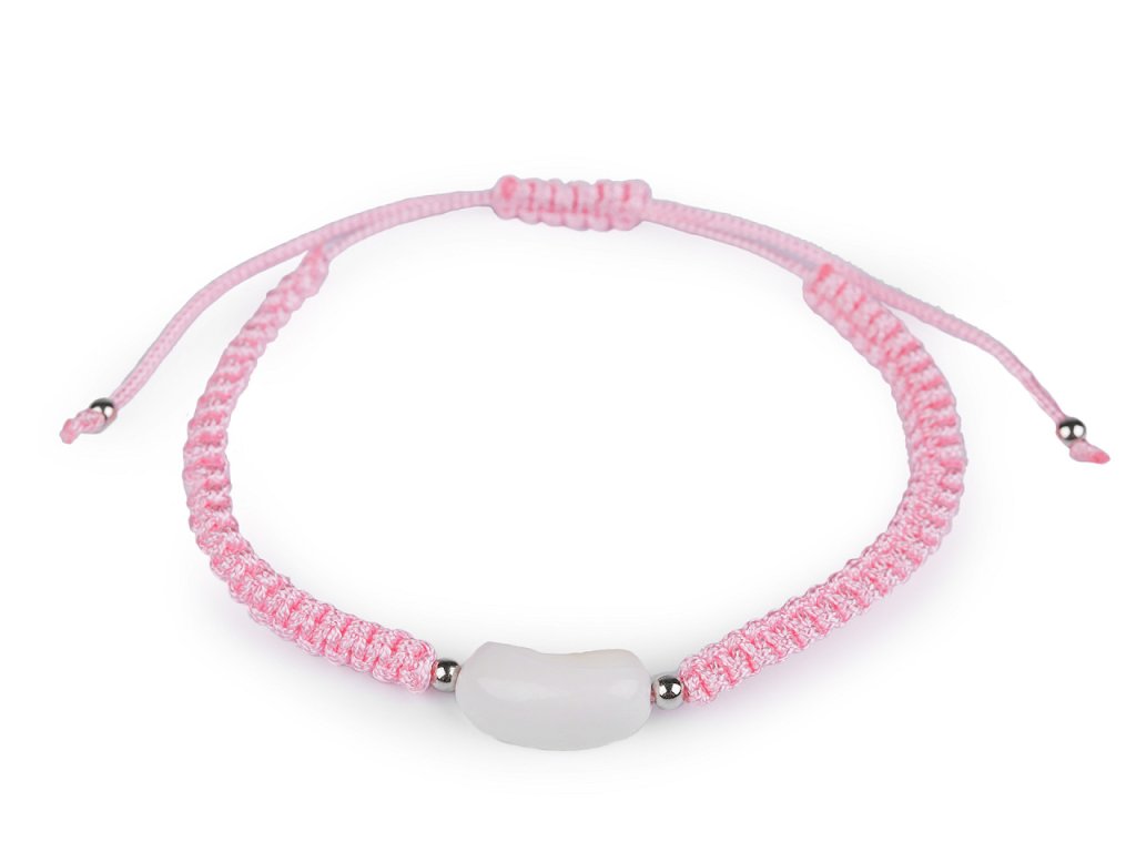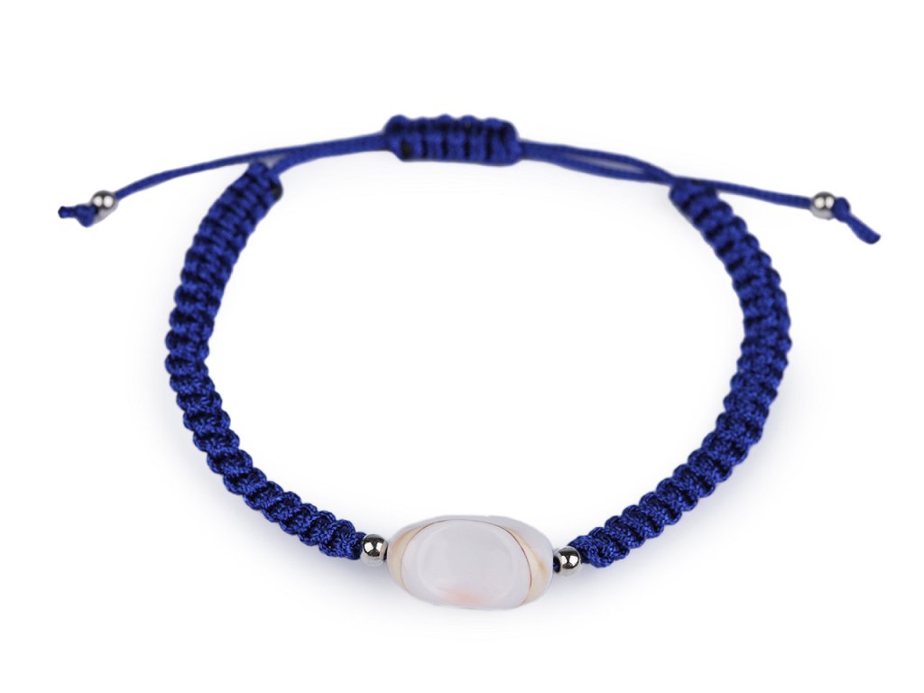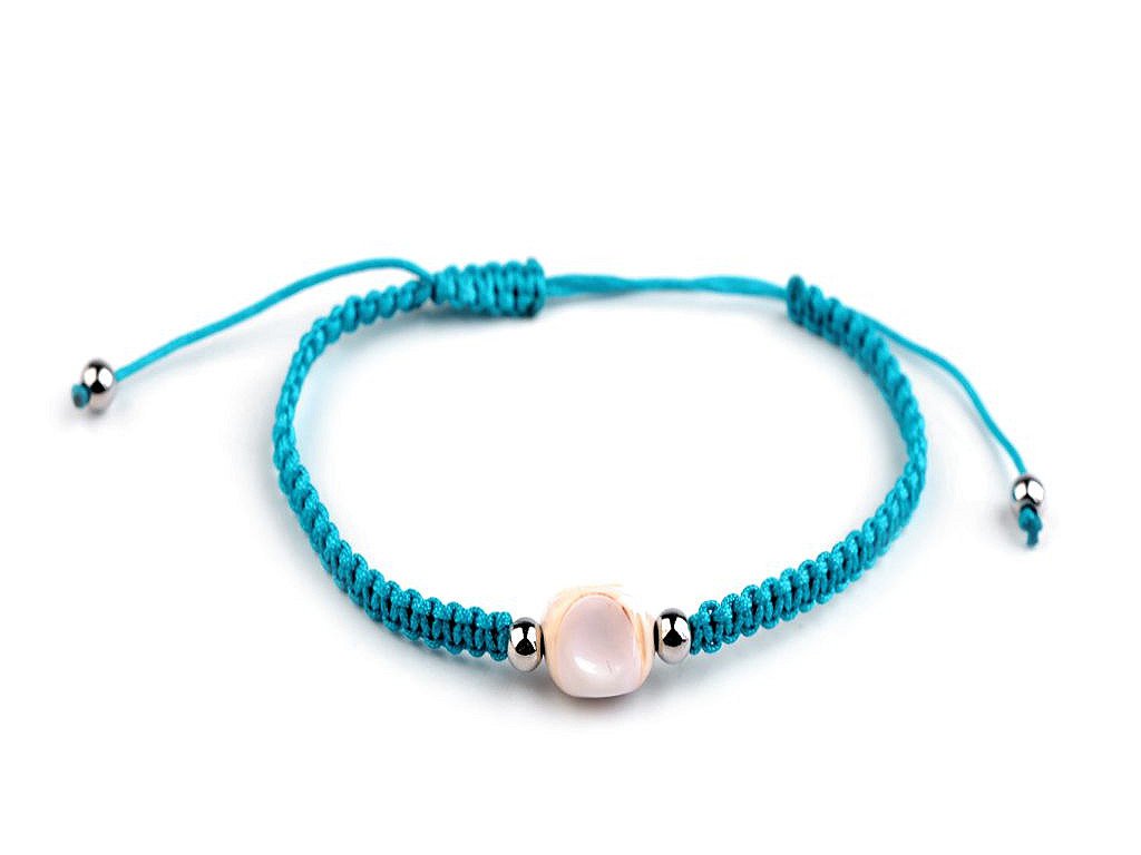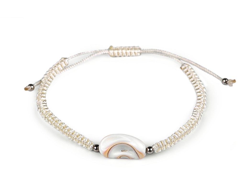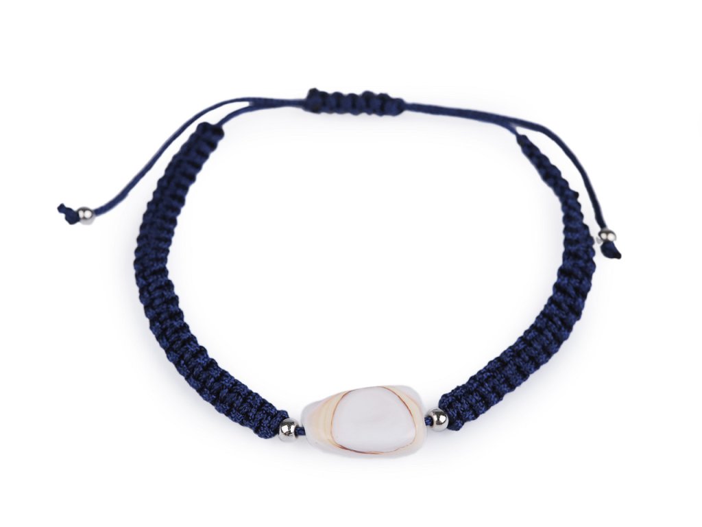 Na macramé šňůrky je doprostřed připevněná mušle a stříbrné plastové korálky. Zapínání je posuvné, oba konce náramku procházejí středovým uzlem, který umožňuje utažení šňůrek. Náramek má univerzální velikost.