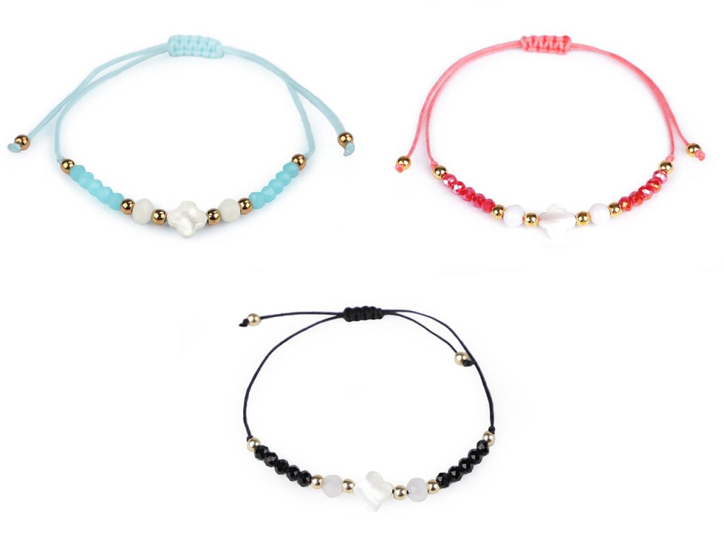 Shamballa náramky s korálkem z přírodní perleti jsou úžasným doplňkem letního outfitu. Hodí se jak k šatům, tak k halenkám, tričkům i plavkám. Perleť doplňují skleněné broušené a kovové korálky. Některé náramky mají AB efekt, jenž způsobuje zajímavé světelné odlesky. Zapínání je posuvné, oba konce náramku procházejí středovým uzlem, který umožňuje utažení šňůrek. Náramek má univerzální velikost.