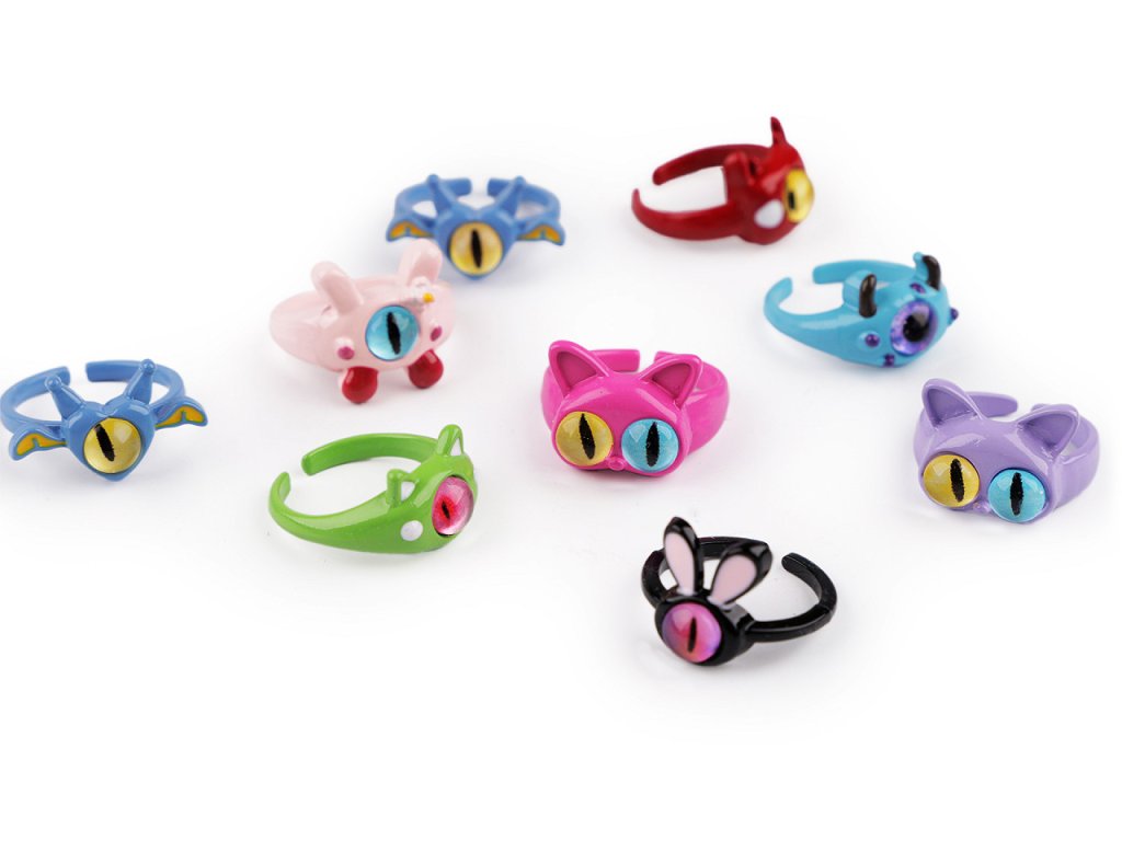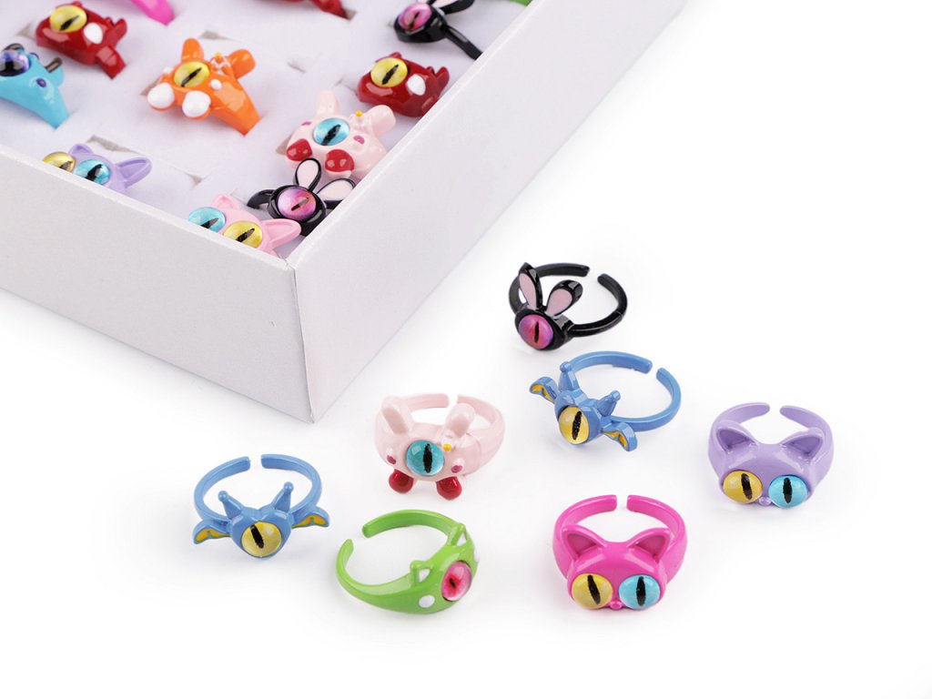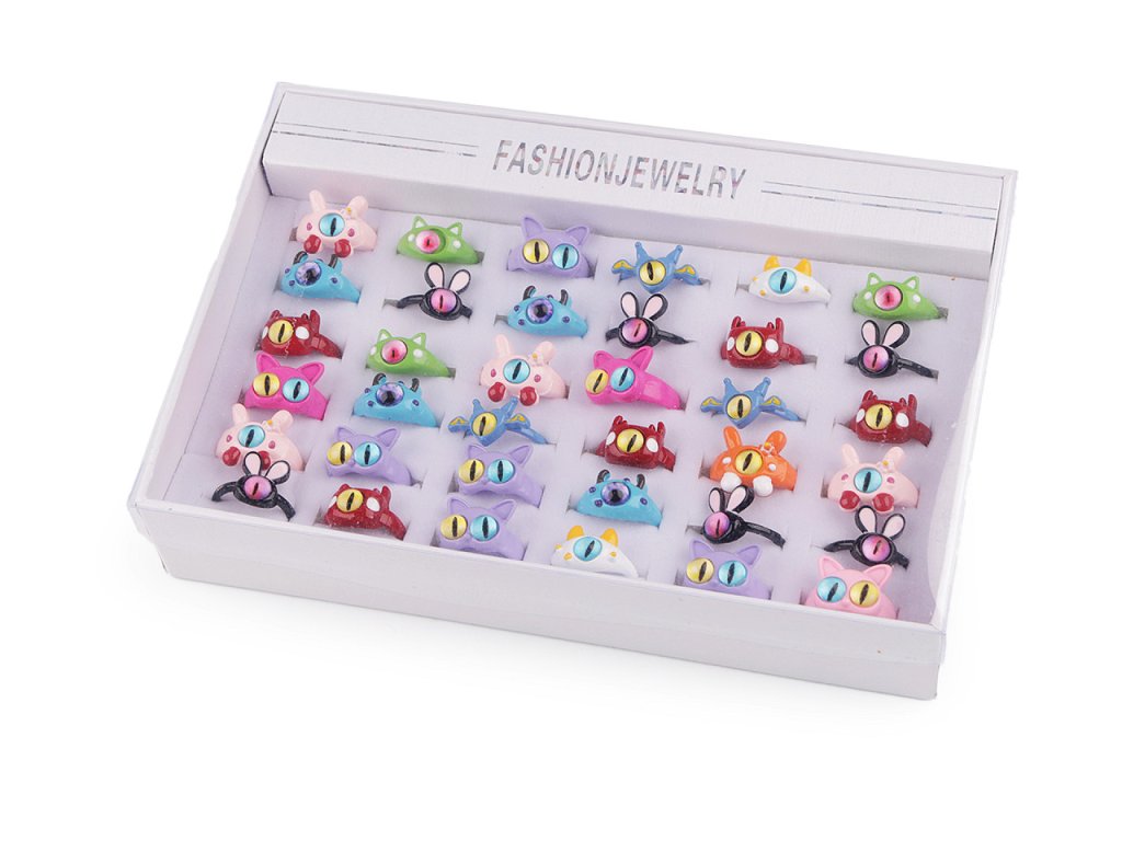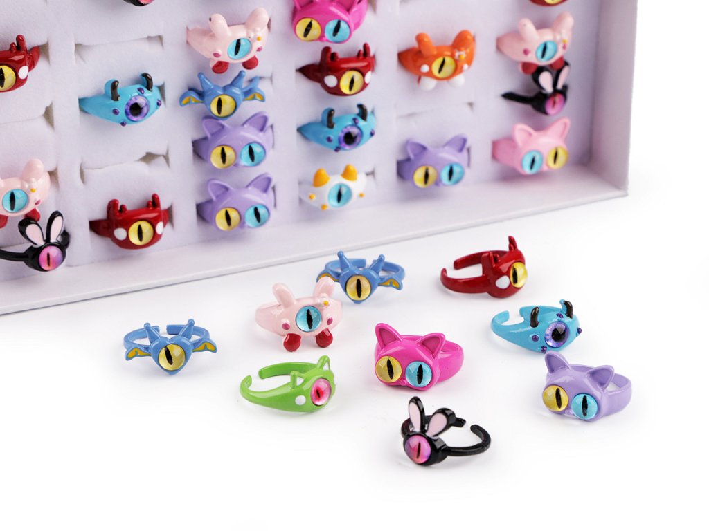 Mix dětských kovových prstýnků s motivy zábavných koček a příšerek je zabalený v papírové kazetě, která má průhledné plastové víko. Je ideální na prodejní prezentaci. Prsteny mají různé tvary a poutavě ozdobené oči, u dětí jsou tyto motivy velice oblíbené.