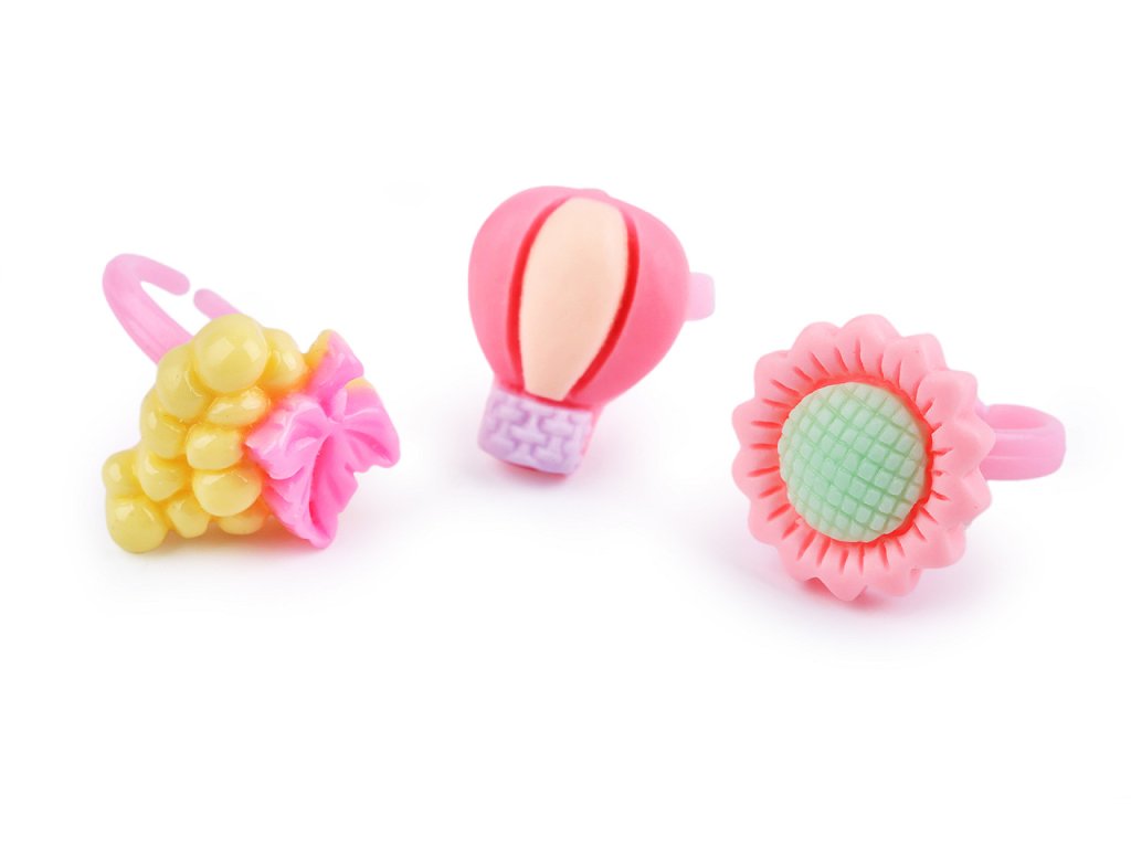 3 dětské prstýnky jsou zabalené v plastové dóze ve tvaru srdce, která má průhledné plastové víčko. Prstýnky jsou ozdobené barevnými 3D ozdobami s různými motivy, u dětí jsou velice oblíbené.