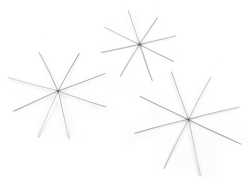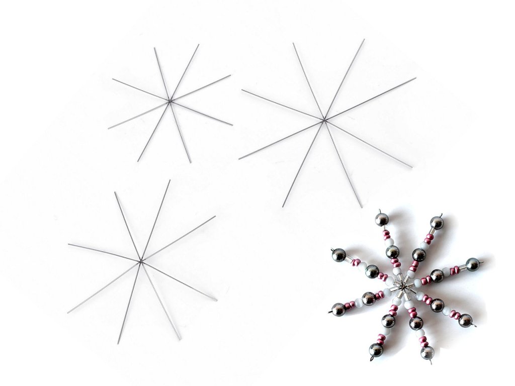 Drátěný základ pro výrobu dekoračních hvězdiček a Vánočních vloček má paprsky, na které můžete navlékat korálky, perličky, velice efektně vypadají voskované perle. Skládá se ze 4 drátů, jež tvoří 8 paprsků. S tímto drátěným základem vytvoříte okouzlující Vánoční vločky a hvězdy velmi snadno a hravě. Stačí navléknout korálky a na konci drátku zatočit očko pomocí kulatých bižuterních kleští. Hotovou hvězdu můžete zavěsit pomocí háčku nebo šňůrky na stromeček, do okna apod.