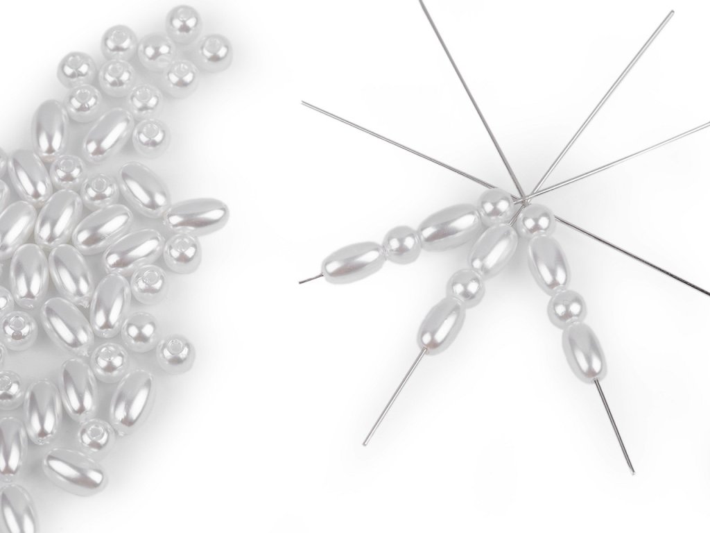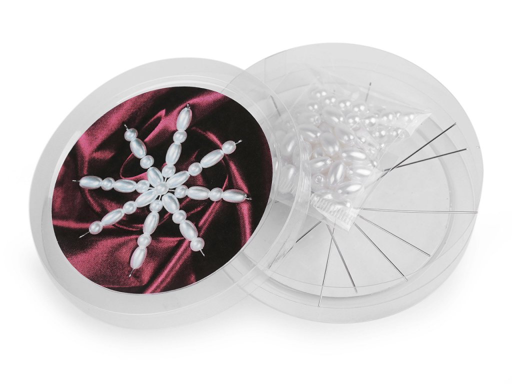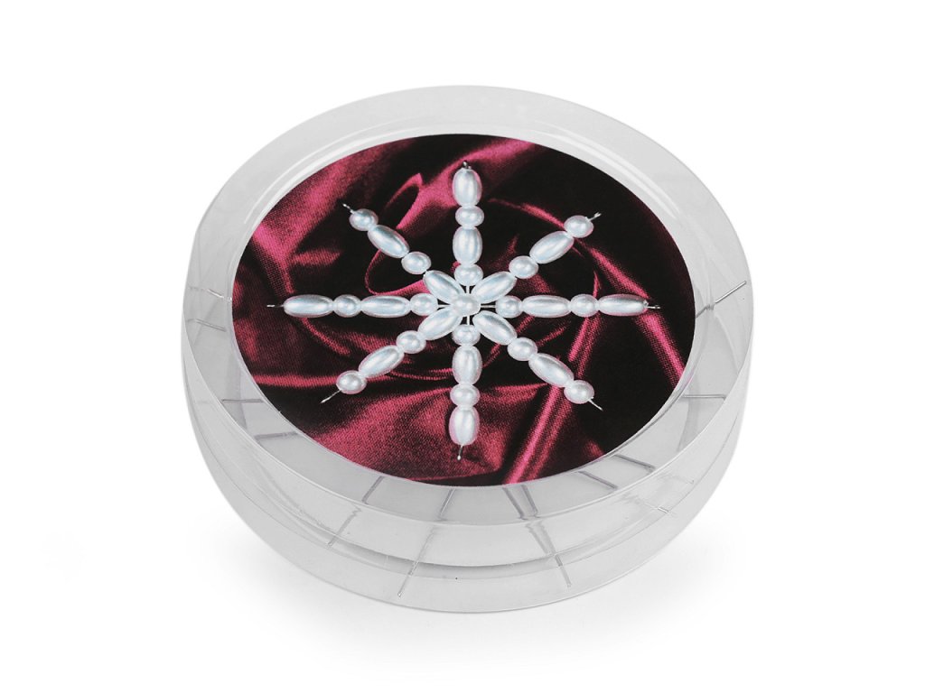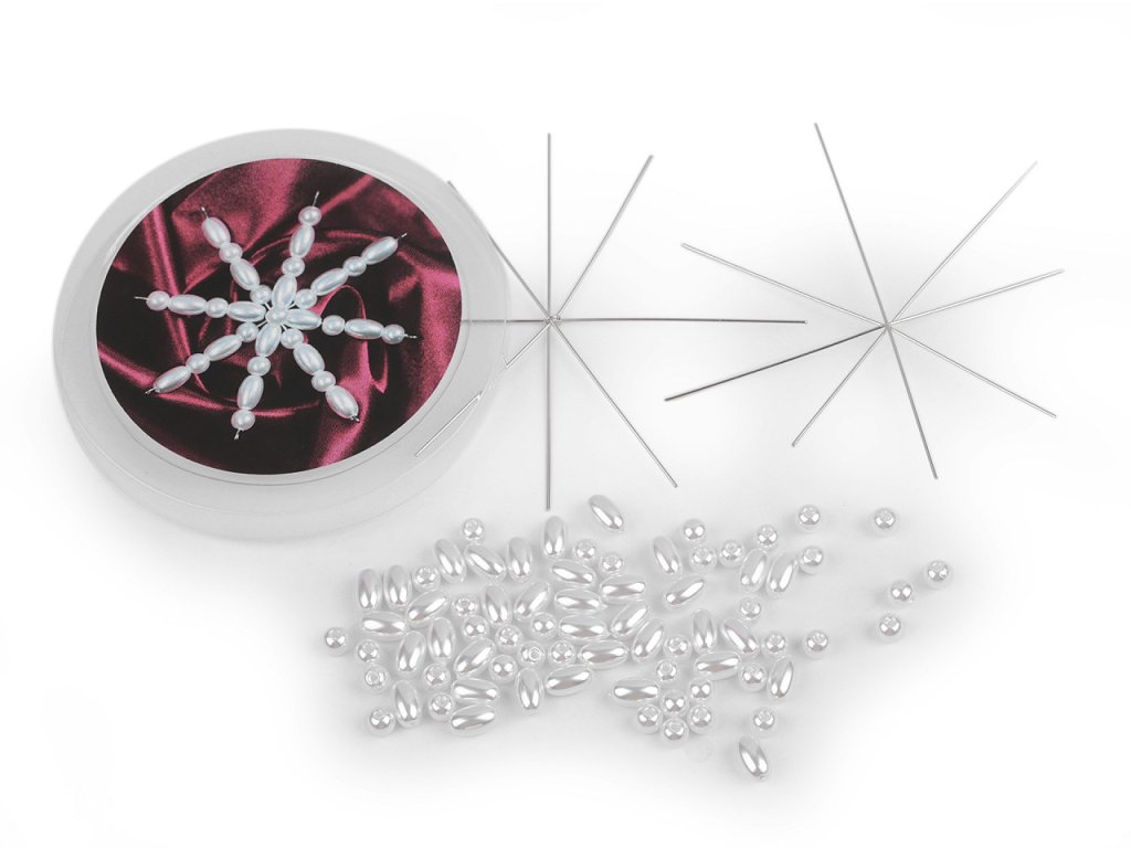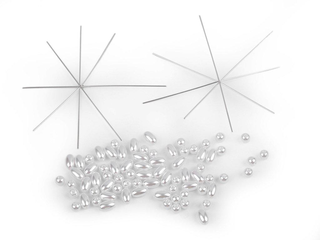 Sada na výrobu vánočních hvězd obsahuje 2 drátěné základy a voskové korálky ve tvaru perel a oliv.