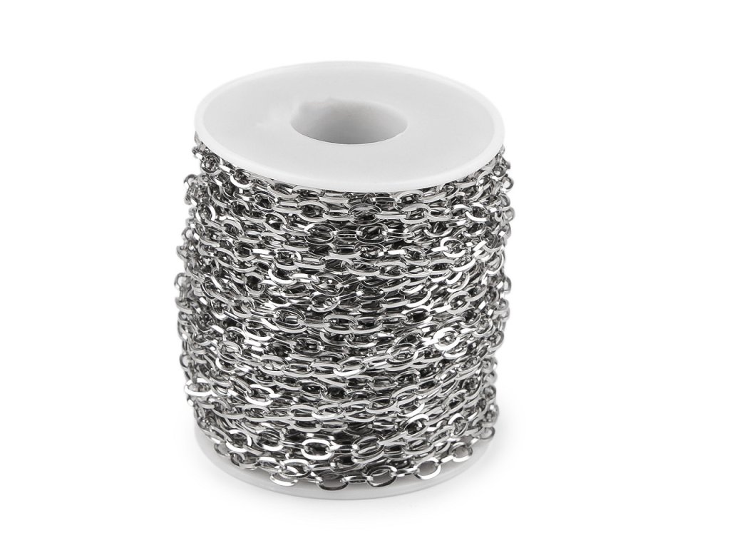 Nerezový řetízek z plochých oválných oček je oblíbený komponent pro tvorbu bižuterie. Je pevný, velice kvalitní. Pomocí spojovacího kroužku na něj můžete připojit zapínání.