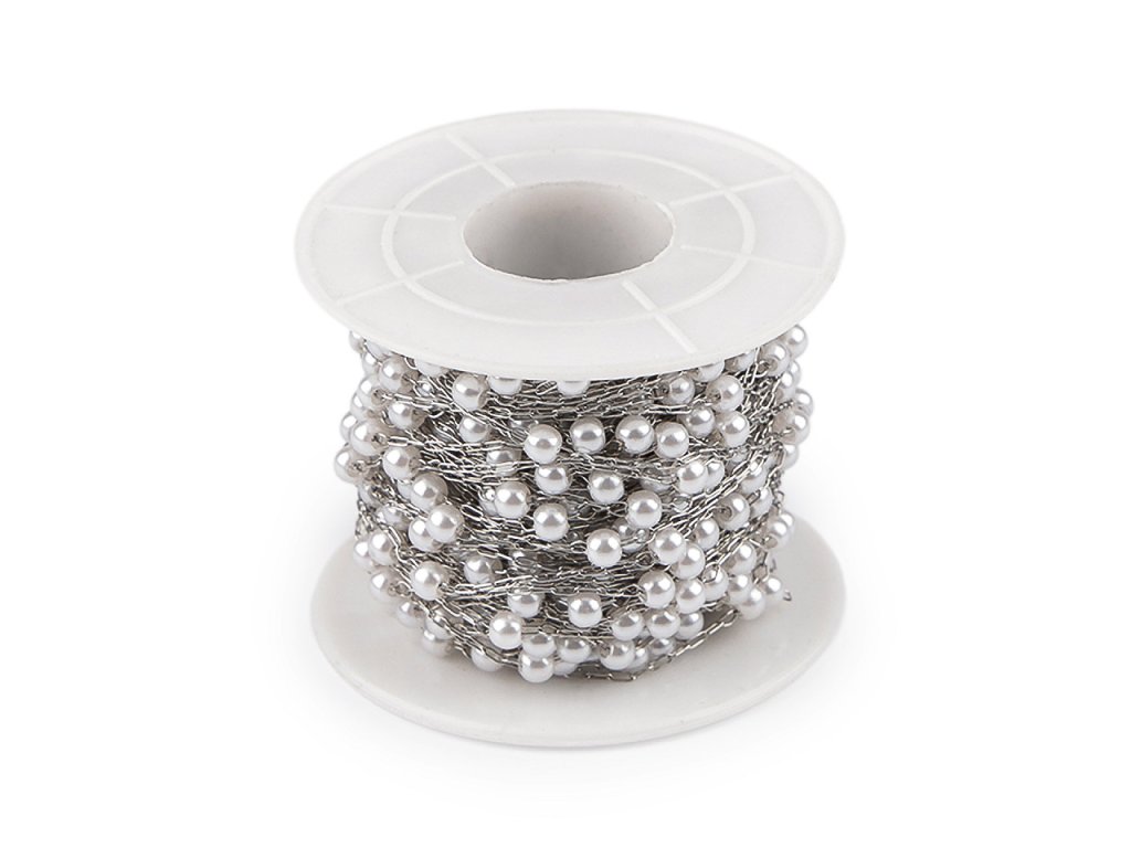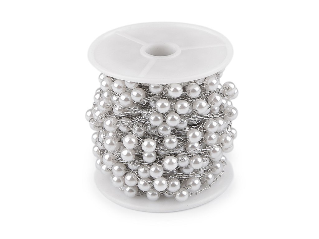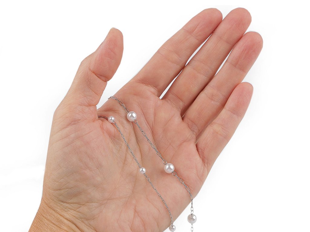 Nerezový řetízek ozdobený perlami je zajímavým komponentem pro tvorbu bižuterie. Je pevný, velice kvalitní, z dlouhých oválných oček. Pomocí spojovacího kroužku na něj můžete připojit zapínání.