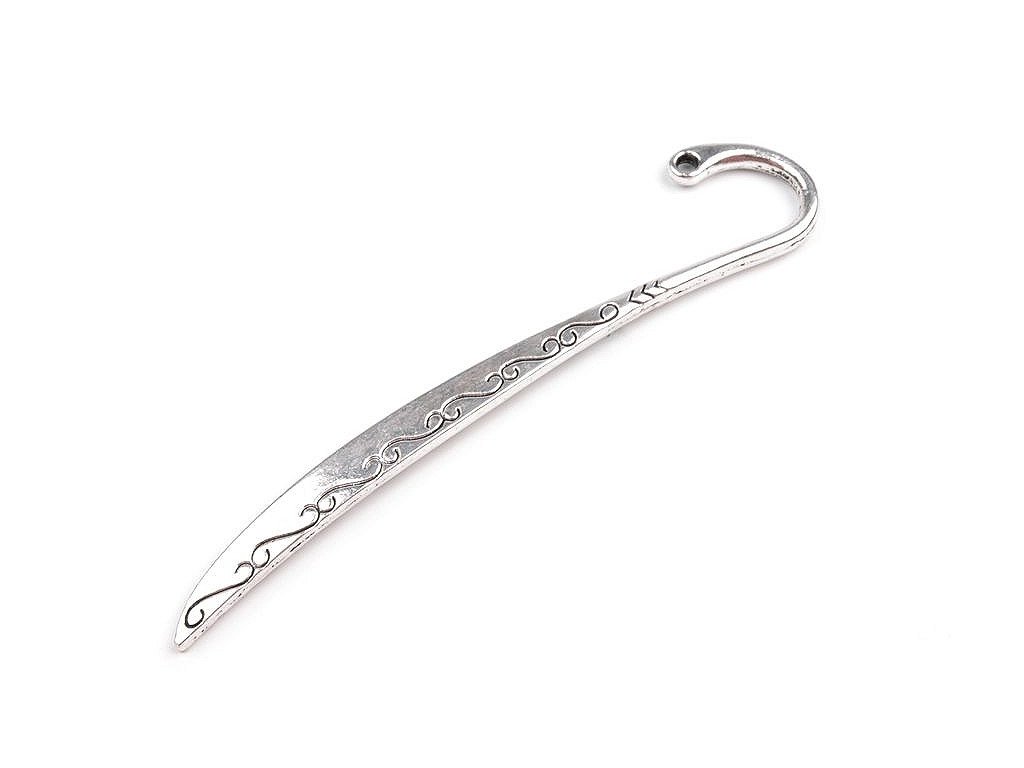 Rozměry: 5 x 85 mm (šířka x délka), průvlek očka 2 mm.Kovový polotovar určený k výrobě záložky do knihy. Je zcela na vás, jak si záložku dotvoříte. Na závěsné očko můžete připevnit řetízek s naketlovanými korálky, přívěsky s fimo hmoty, kovu či dřeva, nebo přivažte kousek stužky nebo bavlnky. Záleží zcela na vaší fantazii a vkusu. Záložka je zdobená ornamenty ve tvaru spirálek, má lehce prohnutý tvar a kulatý háček, který můžete zavěsit za okraj knihy. Zdobení je oboustranné.