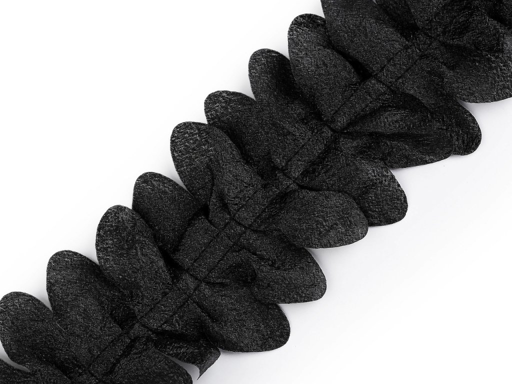 Efektní řasený volán má oba okraje s obloučky, je jednovrstvý, pevně středem prošitý. Jemně se leskne, materiál, ze kterého je vyrobený má lehce strukturovaný povrch. Dodá elegantní vzhled šatům, sukním, halenkám i tričkům, vytvoří efekt lehké vzdušnosti. Dá se našít na manžety, ozdobí karnevalové a taneční kostýmy a klobouky. Pro větší efekt jej doporučujeme našít v několika řadách. Můžete z něj jednoduše vyrobit i nádherné květy.