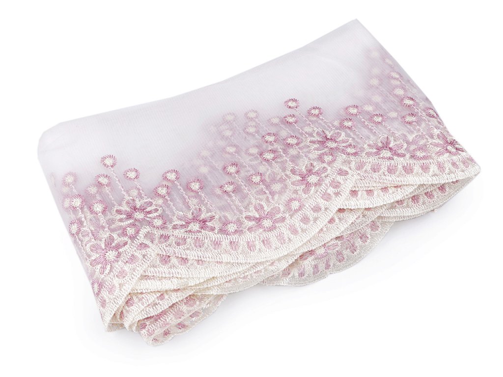 Krajka na monofilu je ozdobená květinovým motivem, jemně se leskne. Zdobený okraj je zakončený obloučky dlouhými 16 cm.