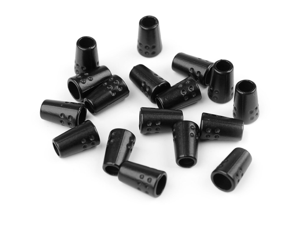 Kovovou koncovku využijete k ozdobnému zakončení šňůrek, které lemují kapuce nebo spodní lem mikin, bund, kabátků, pasu šatů apod. Zabraňuje vytažení šňůry z tunýlku. Její dolní část je ozdobená jemným tečkovaným reliéfem.