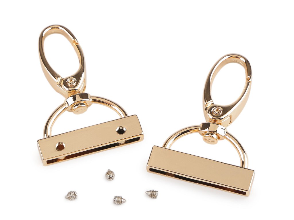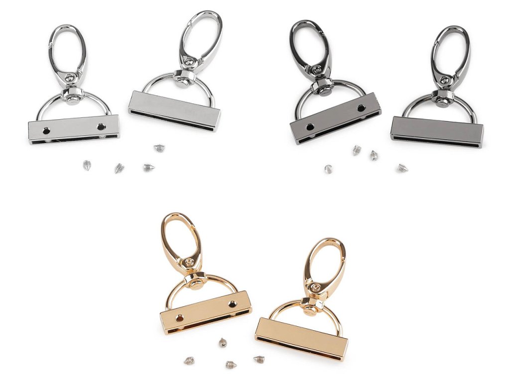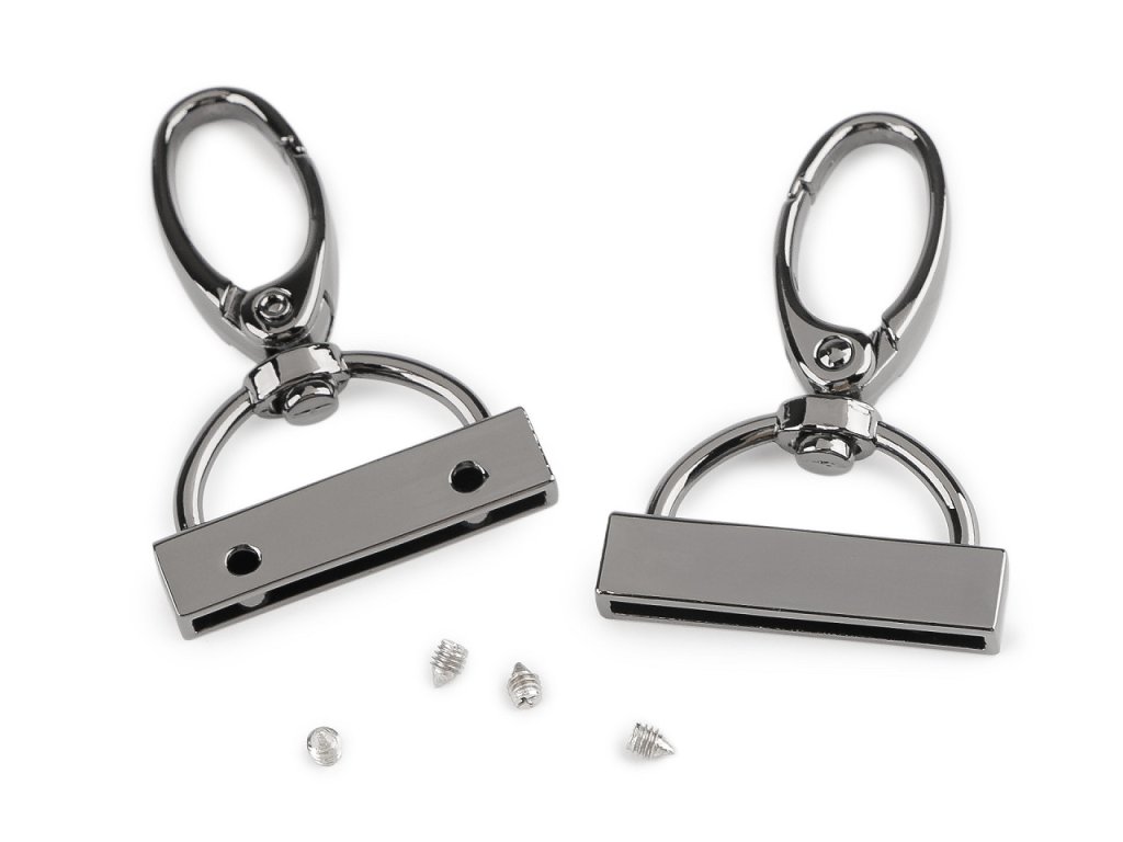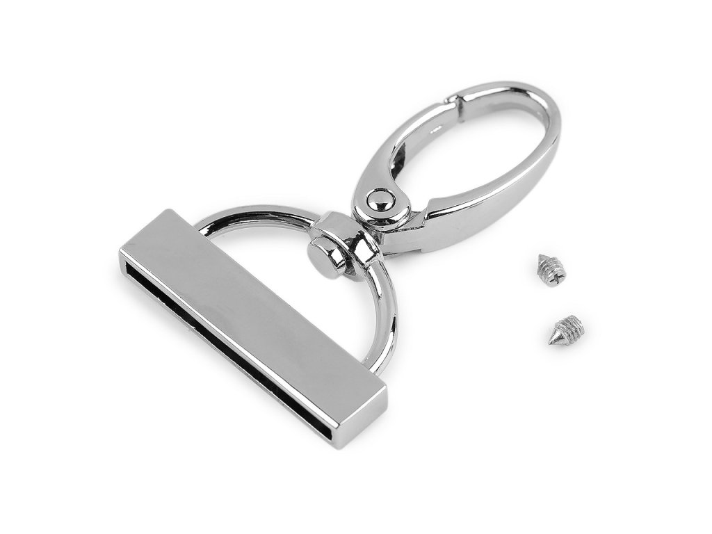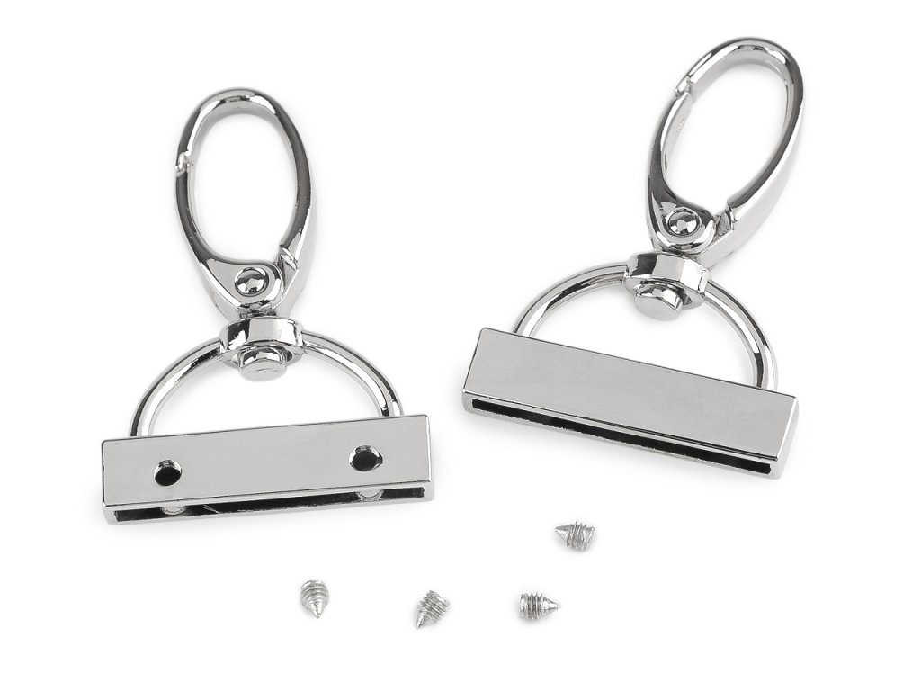 Koncovka na popruhy s otočnou karabinou má vysoký lesk. Přilepíte do ní konec popruhu či jiného materiálu (s tloušťkou do 2,5 mm), který následně uchytíte přiloženými šroubky.