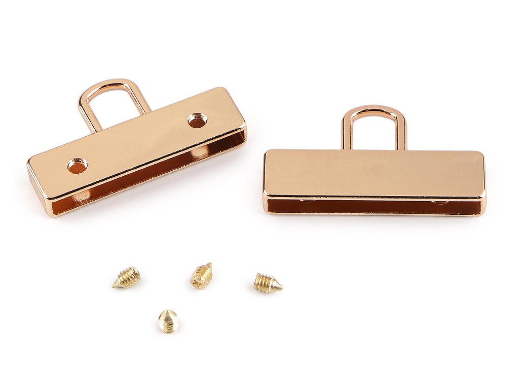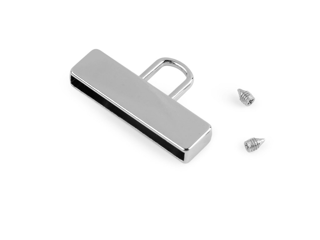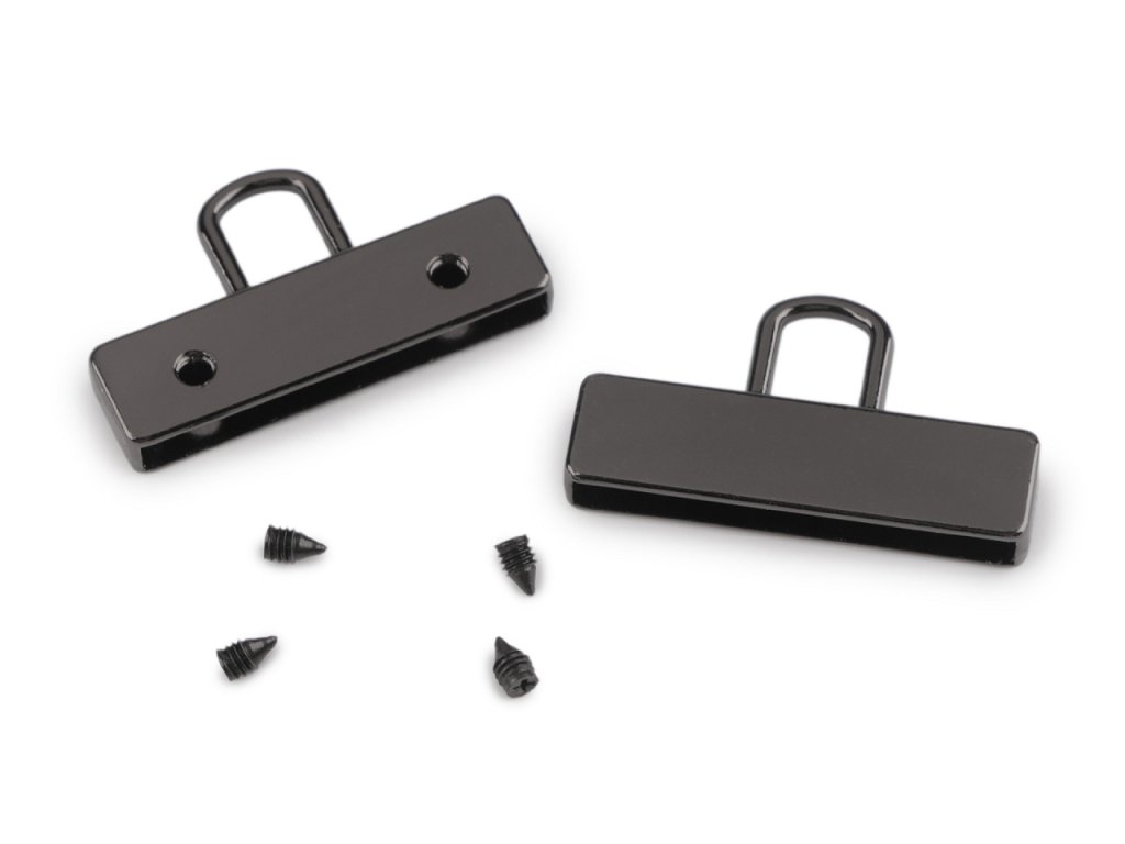 Koncovka na popruhy má vysoký lesk. Přilepíte do ní konec popruhu či jiného materiálu (s tloušťkou do 3 mm), který následně uchytíte přiloženými šroubky.