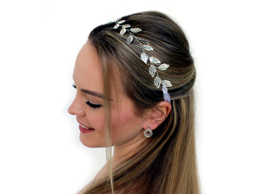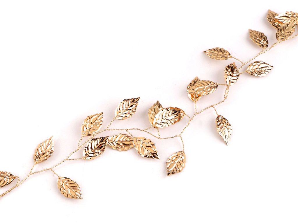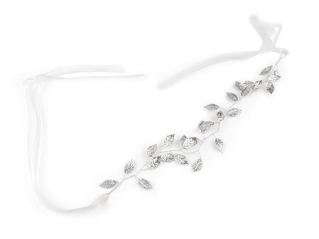 Romantická ozdoba s lístky a stuhou bude elegantním doplňkem vašich vlasů. Je tvořená z dvou do sebe zapletených drátků, na které navazují lístky. Díky drátkům je ozdoba lehce ohybatelná, můžete ji prostorově tvarovat. Čelenku využijete jako nevšední doplněk na svatby, plesy a jiné slavnostní události.