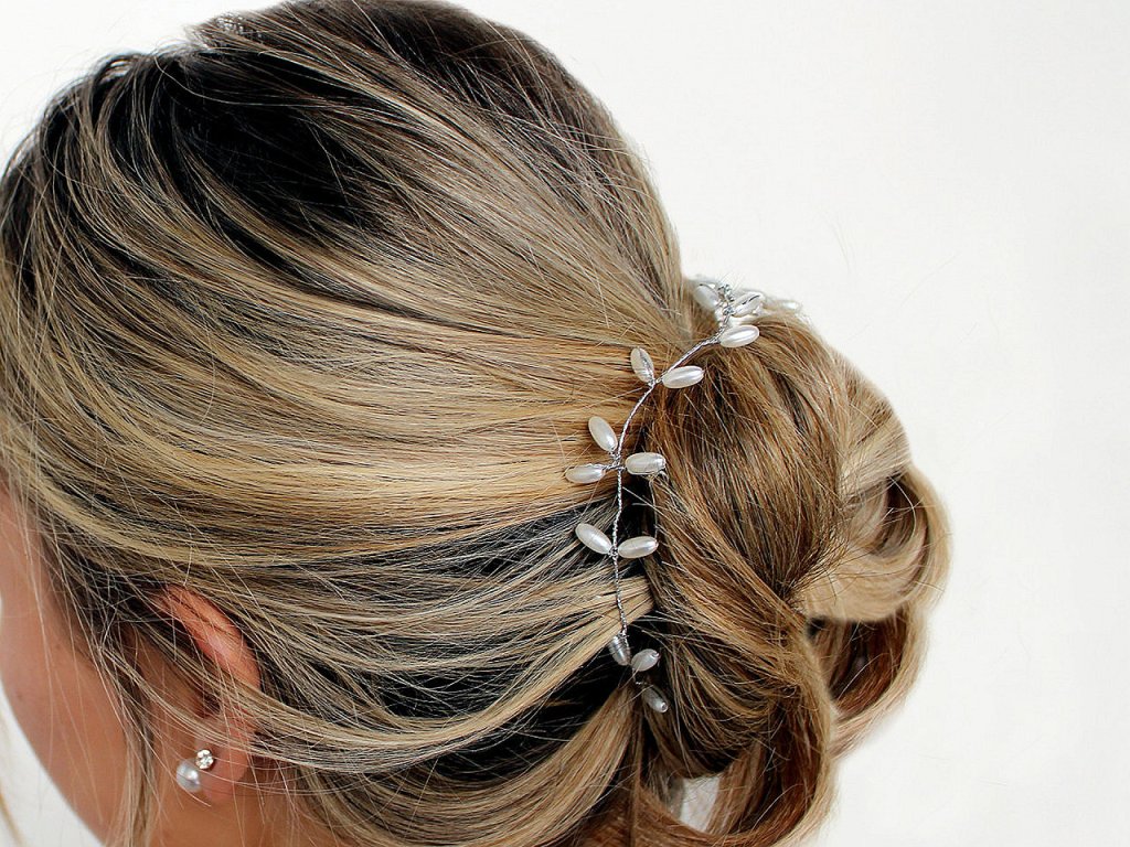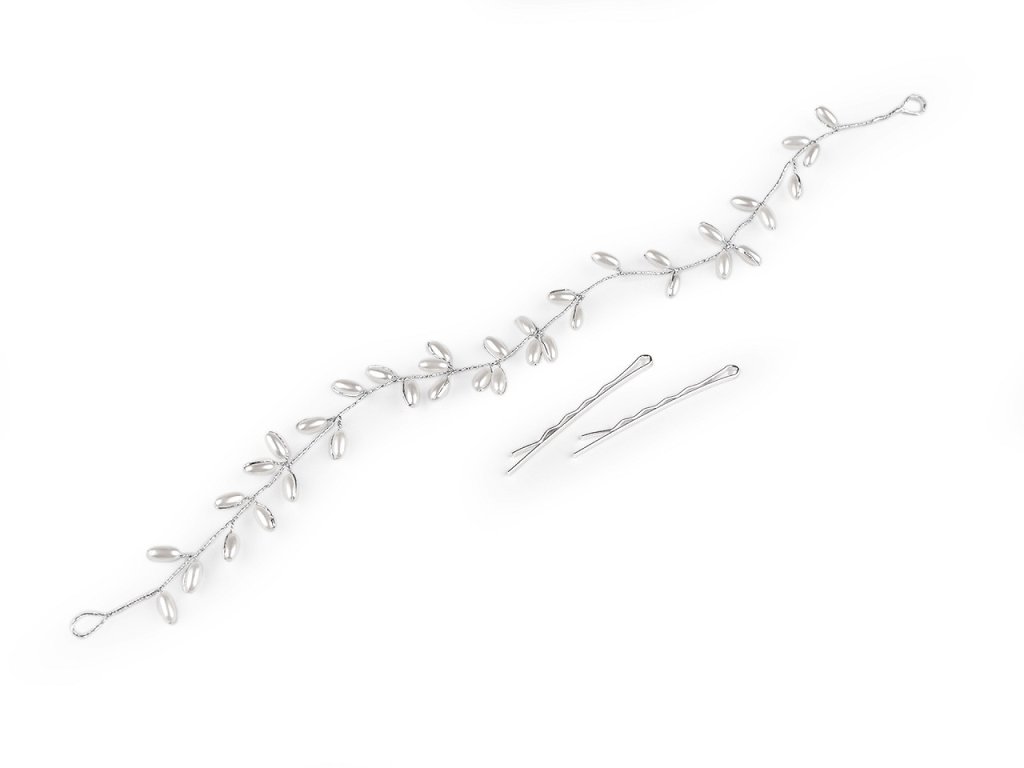 Romantická ozdoba s perlovými korálky bude jemným a elegantním doplňkem vašich vlasů. Je tvořená z dvou do sebe zapletených drátků, do kterých jsou vkomponované podlouhlé voskové korálky připomínající perly. Díky drátkům je ozdoba lehce ohybatelná a lze ji prostorově tvarovat. Čelenku využijete jako nevšední doplněk na svatby, svaté přijímání či na plesy.